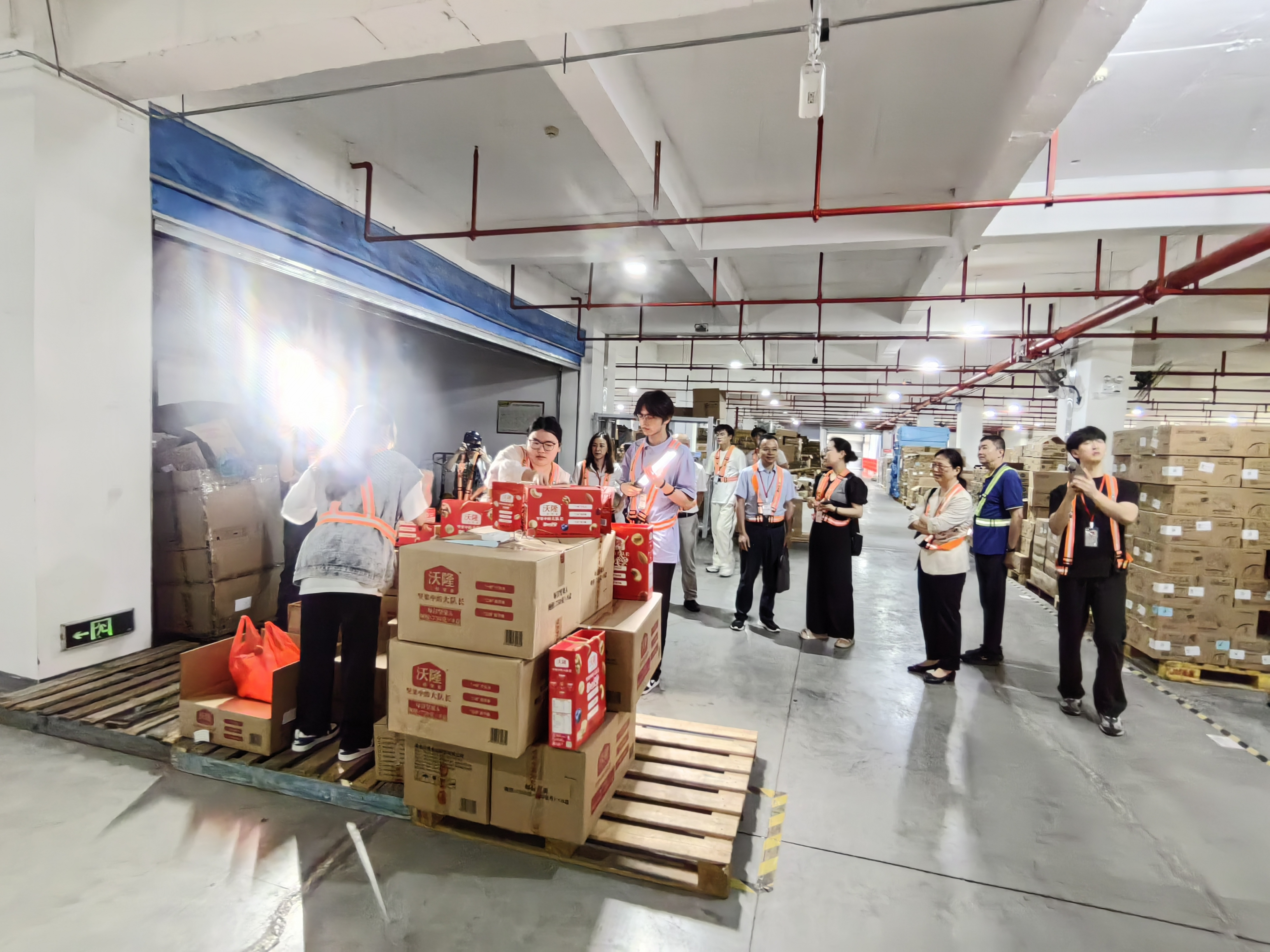 在企业总经理梁世江陪同下,刘光明一行先后参观了企业智能化仓储中心和直播电商运营基地,深入了解企业智慧供应链体系的运作模式,观摩自动化分拣、智能仓储管理、重包车间等先进技术设备。
