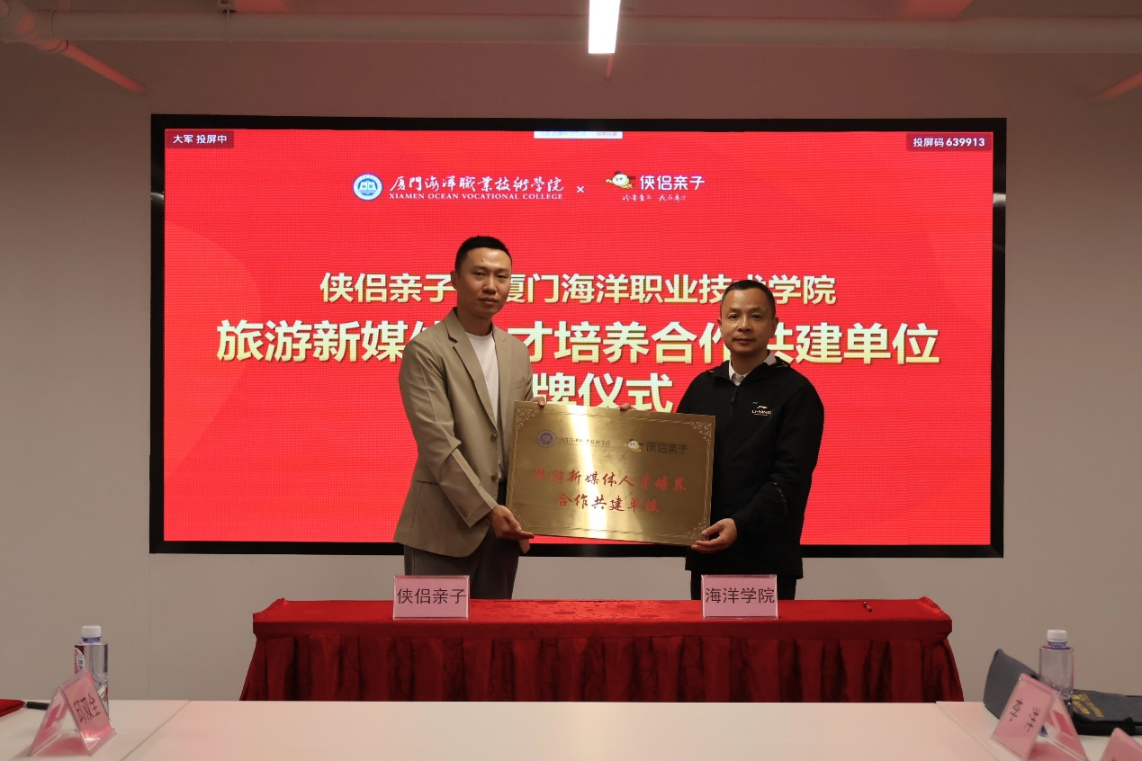 座谈会上,双方围绕基地共建、人才培养及培训平台建设等议题进行了深入交流,达成了广泛共识。随后,海洋文化与旅游学院院长李洋与翁小钧代表双方签署校企战略合作协议,刘光明为侠侣亲子授予“旅游新媒体人才培养合作共建单位”牌匾。