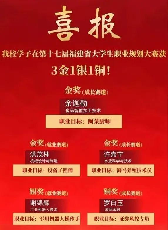 近日,福建省教育厅公布第十七届福建省大学生职业规划大赛获奖名单。我校学子在大赛中发挥出色,获优秀组织奖,斩获3金1银1铜,金奖数位居全省高职院校第一!