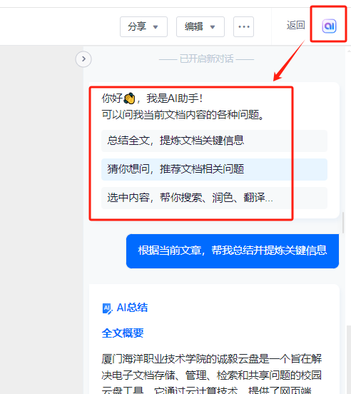 在文件在线编辑/预览界面,点击右上角的“AI助手”开启,支持“快速总结全文、推荐文档相关问题快速进行问答、选中内容进行翻译/解释/提炼/润色/续写/搜索”等功能,如图3所示。