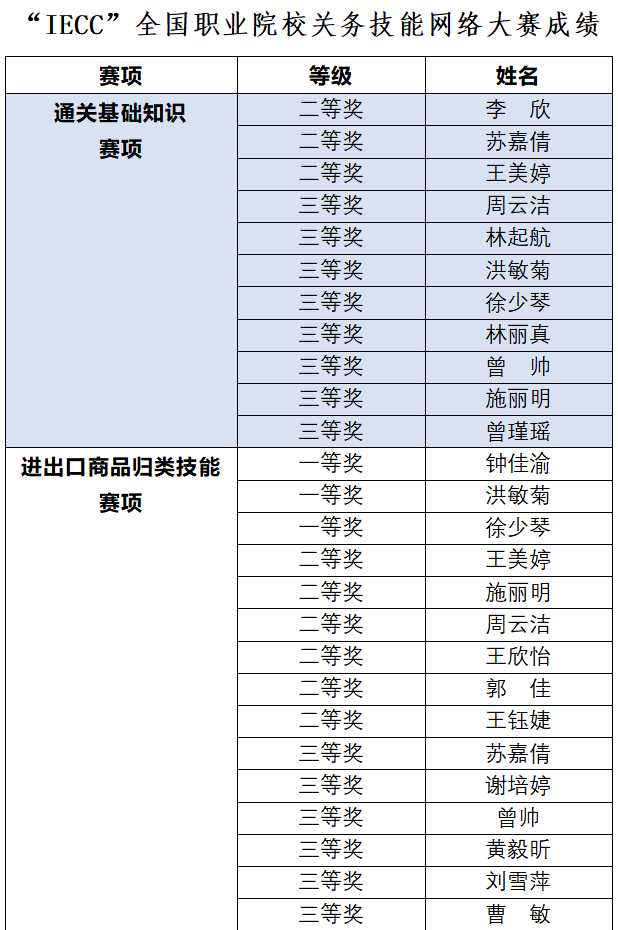 “IECC”全国职业院校关务技能网络大赛由中国报关协会报关行业职业教育工作委员会主办,自2014年至今已举办十一届,具有较大影响力。比赛内容包括商品归类、报关单证等多个方面,旨在检验职业院校专业教学水平,推进岗、课、赛、证一体化教学改革。其中,“IECC”是Innovation创新、Endeavor 奋斗、Confidence 自信、Challenge 挑战的英文缩写。