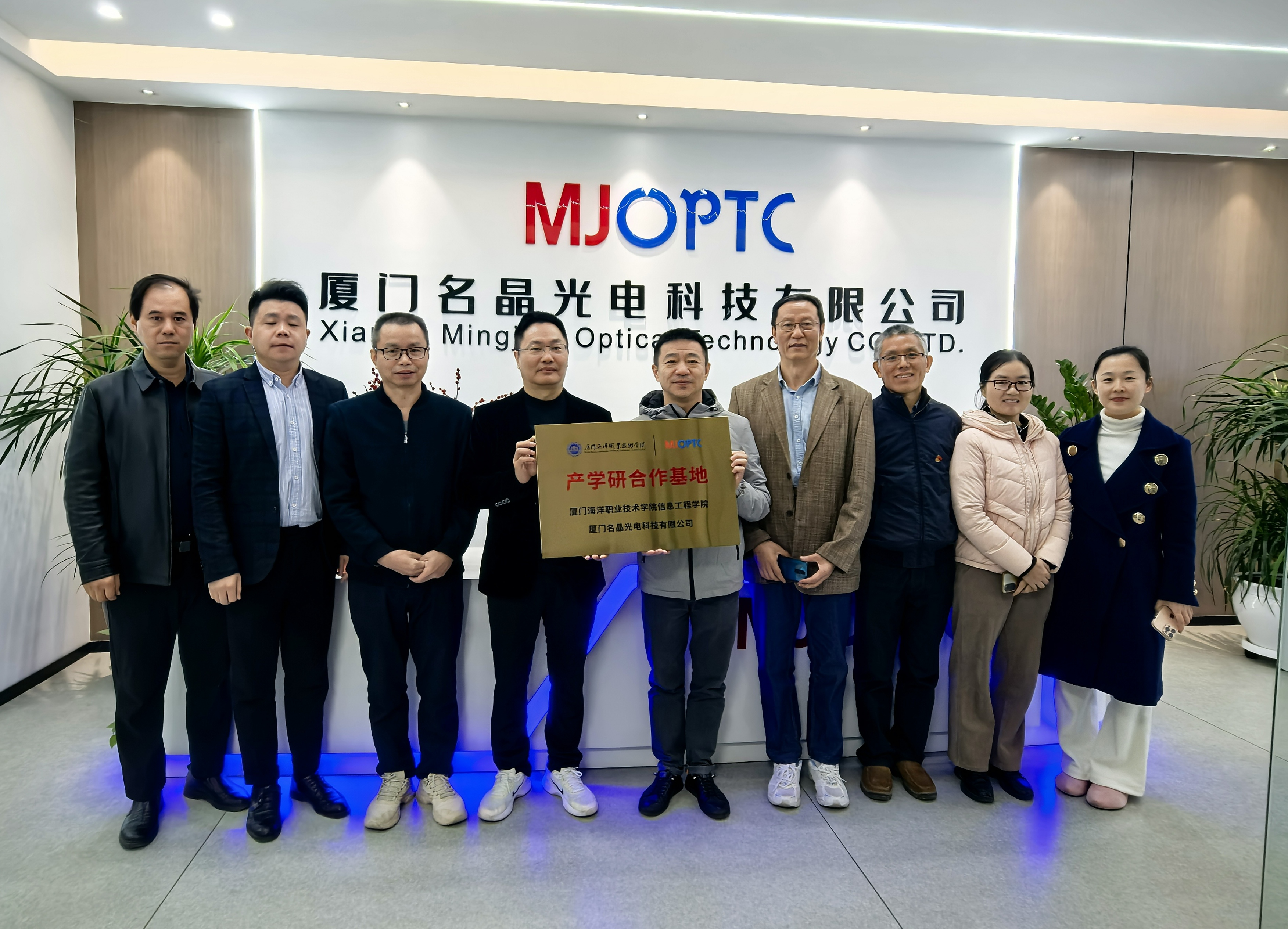在厦门名晶光电科技有限公司,双方就光电行业发展、人才需求、产学研合作等方面进行交流,并举行厦门名晶光电科技有限公司产学研合作基地授牌仪式。