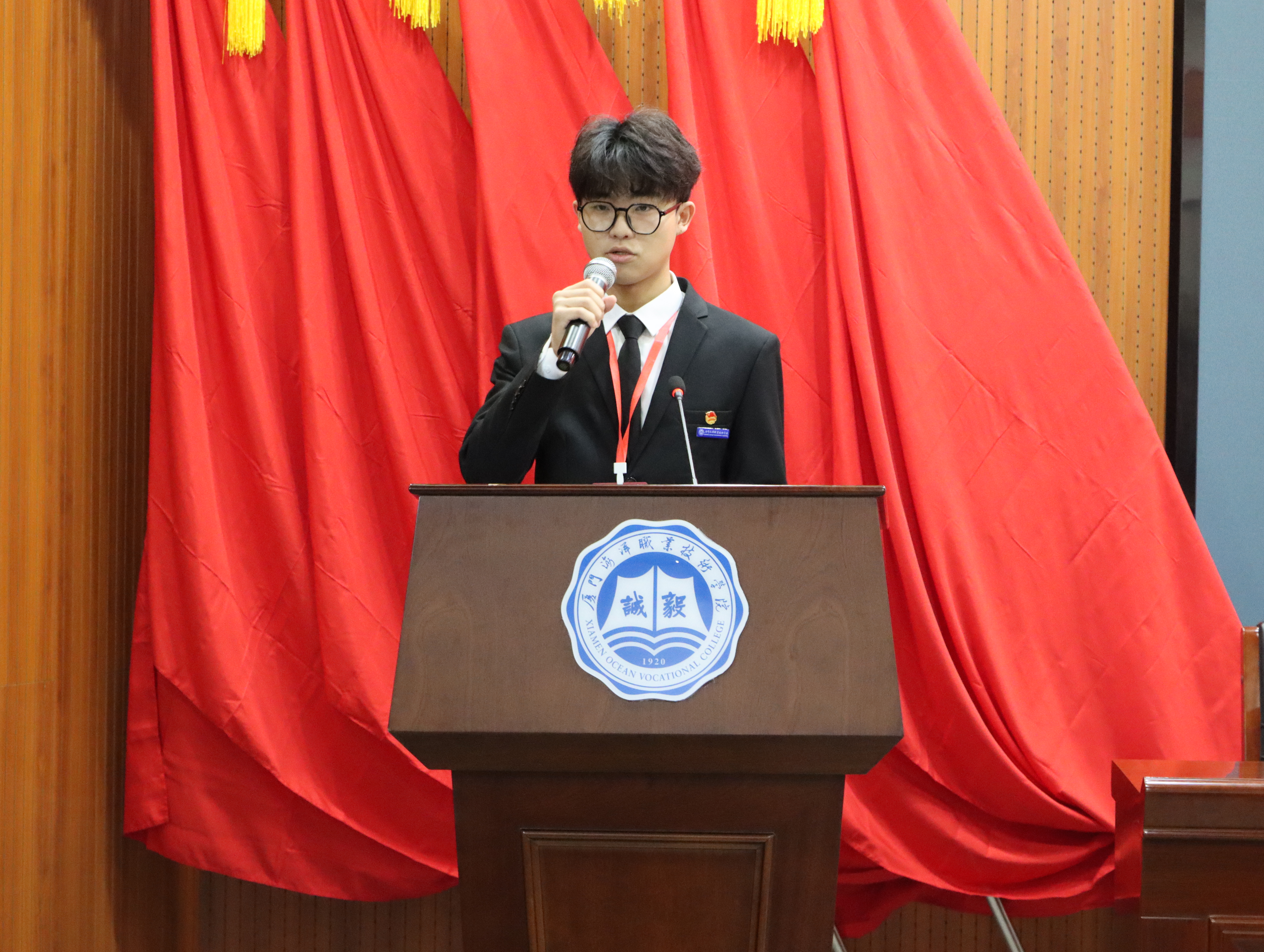 会上,沈炜贤同学代表第十八届校学生会作题为《青春挺膺担当 团结带领海院青年为创建高水平职业教育类型海洋大学奋勇向前》的工作报告。