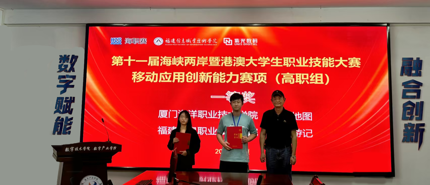 2024年11月2日至3日,由福建省教育厅、福建省人力资源和社会保障厅、福建省互联网信息办公室和平潭综合实验区管委会主办,福建信息职业技术学院承办的第十一届海峡两岸大学生职业技能大赛—移动应用创新大赛在福建信息职业技术学院平潭校区举行,进入决赛的16支队伍,经过激烈的角逐,厦门海洋职业技术学院代表队荣获一等奖和二等奖。