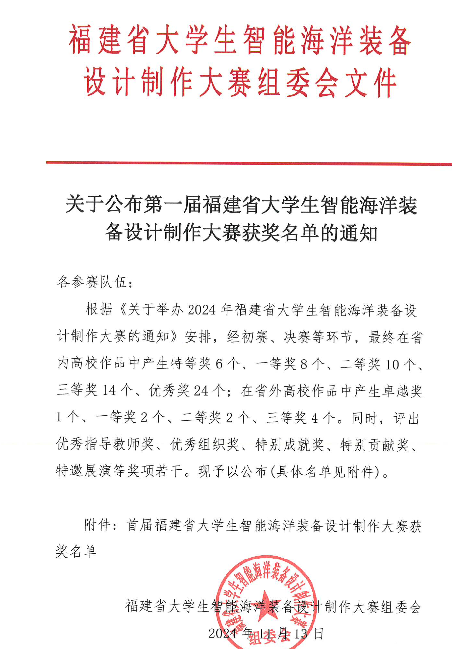 11月9日至10日,由福建省教育厅主办,福建理工大学、福州市海洋经济科创高地联合承办,中船蓝荟(福建)海洋装备会展有限公司等作为支持单位的首届福建省大学生智能海洋装备设计制作大赛在福州旗山湖公园成功举办。大赛闭幕式、颁奖典礼于11月18日在福建海峡会展中心5号厅隆重举办。
