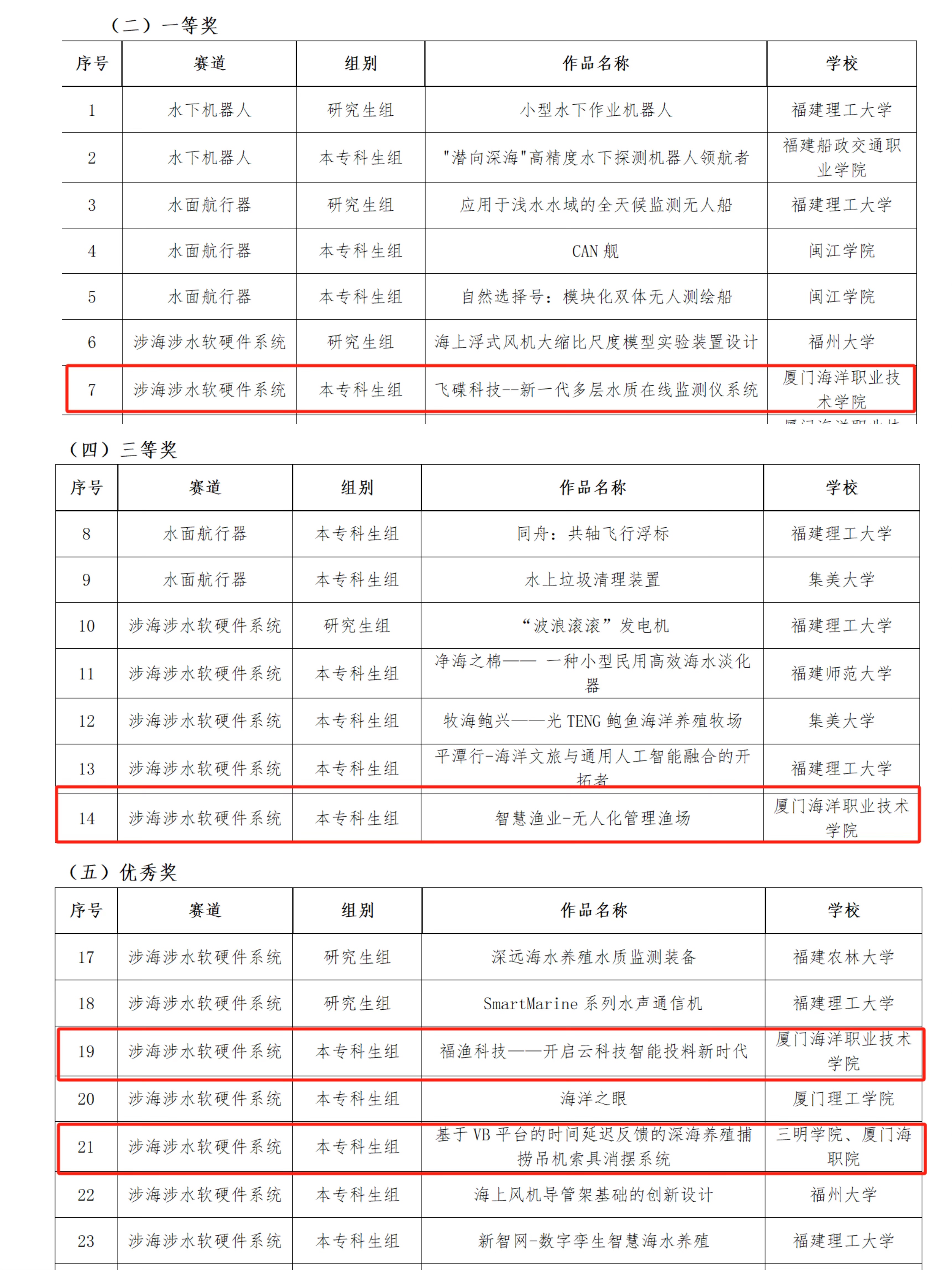 《智慧渔业——无人化管理渔场》获涉海涉水相关软硬件系统赛道“三等奖”,项目指导老师:魏茂春、王忠杰;项目负责人:李伟峰,团队成员:洪茂林、黄秋玉、乐顺、林涵、魏嘉伟、尤鹏涛、尤铭城。