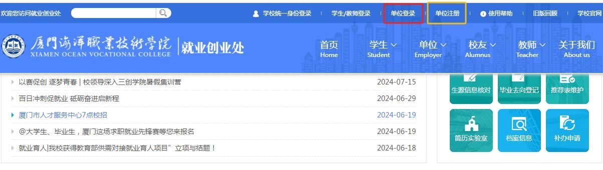 招聘单位进入我校就业创业处官网(https://jy.xmoc.edu.cn/career/index),首页右上角点击“单位登录”——点击“待办事项”—点击“正在报名的招聘会”进行招聘会报名(未注册单位请先完成“单位注册”,审核通过后再登入报名)。