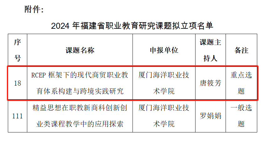 在2024年福建省职业教育研究课题申报工作中,国际商贸学院共2个项目获得立项。其中RCEP研究中心唐筱芳老师申报的课题《RCEP框架下的现代商贸职业教育体系构建与跨境实践研究》获得重点课题立项,该课题聚焦区域内教育资源不均和技能差异等问题,围绕RCEP区域职业教育合作,探索构建适合RCEP区域经济发展的现代商贸职业教育体系,培养区域经济发展所需的商贸职业技术人才,促进区域经济一体化。罗娟娟老师的课题《精益思想在职教新商科创新创业类课程教学中的应用探索》获得一般课题立项。