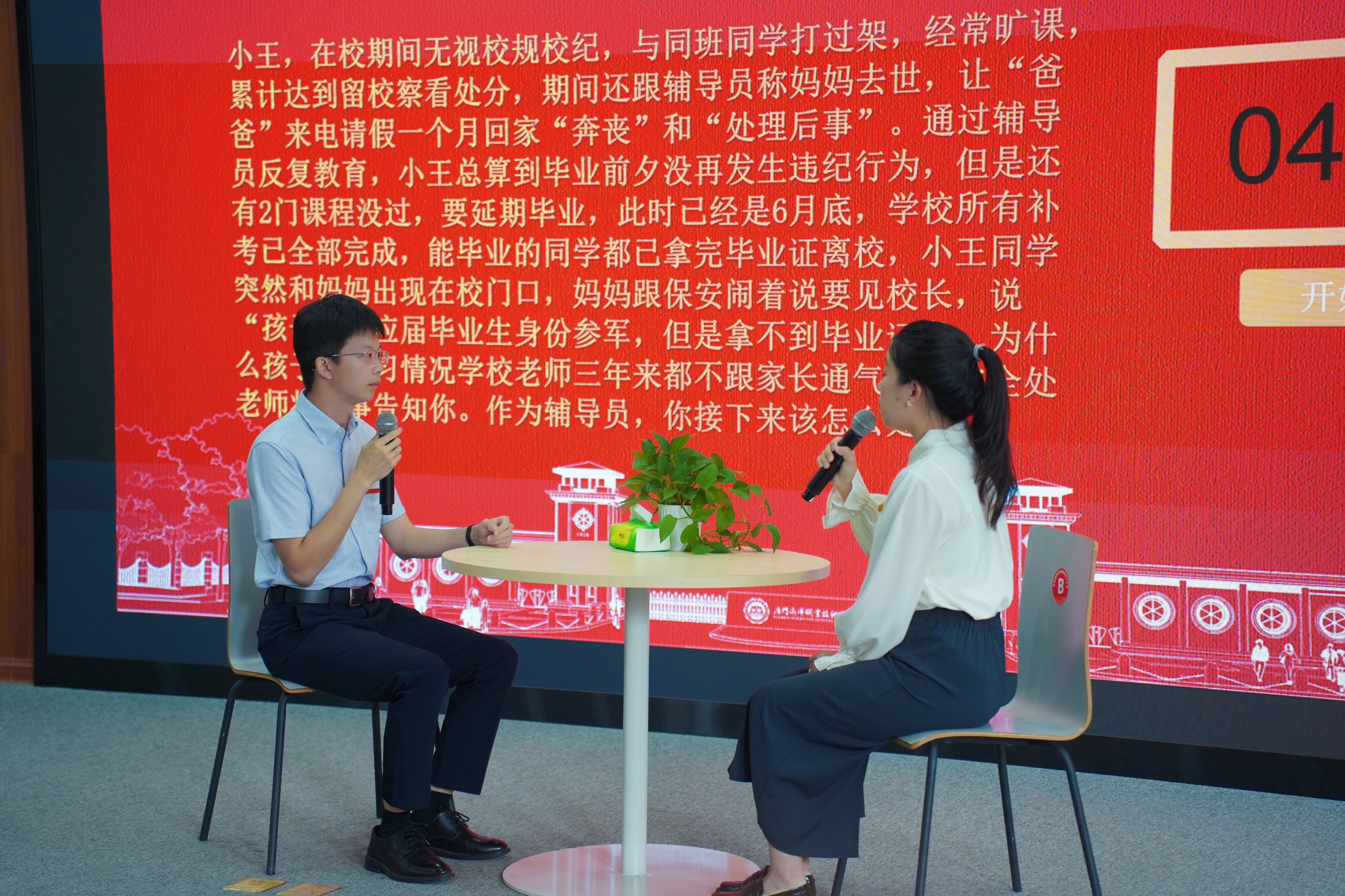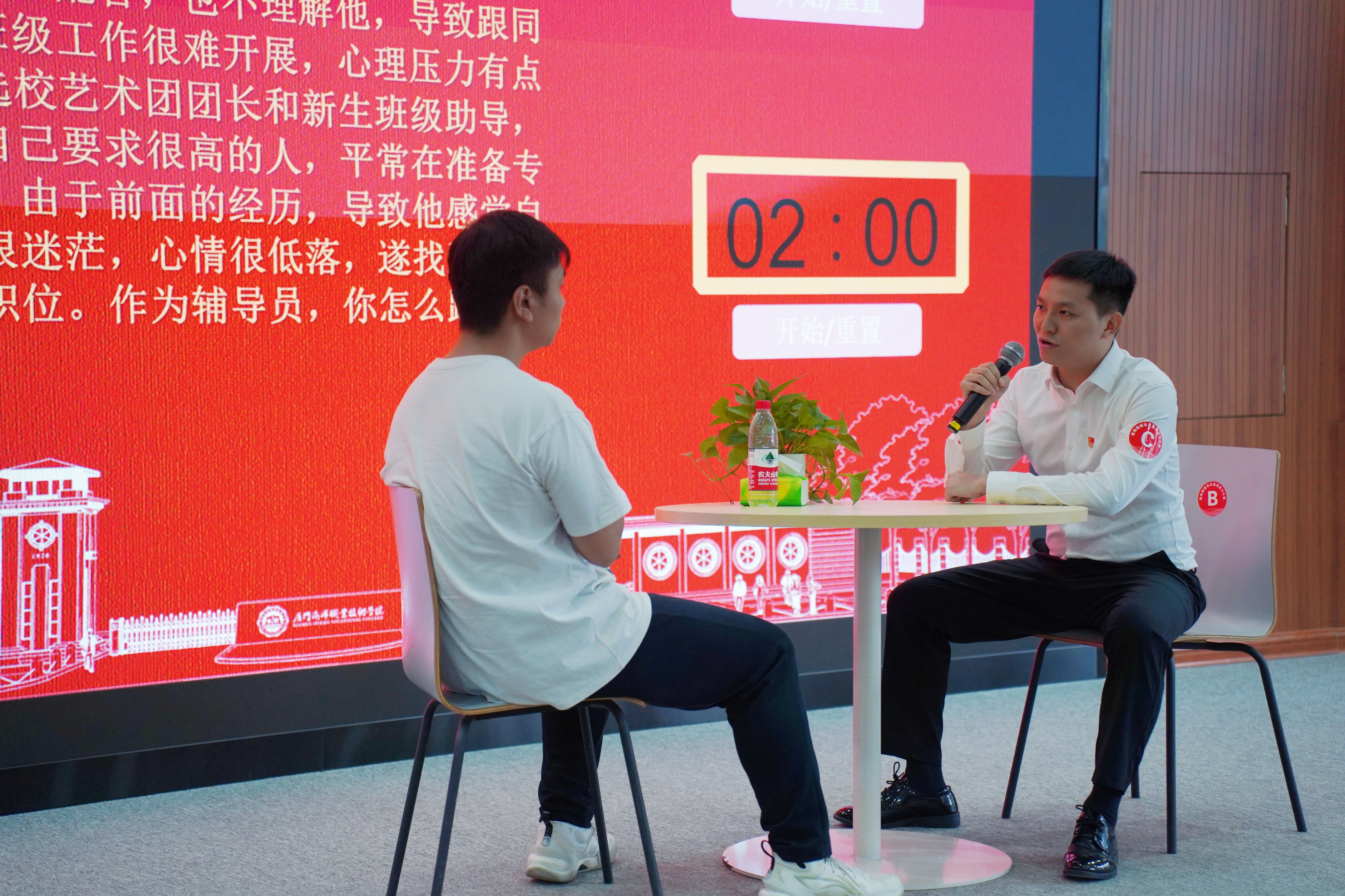 谈心谈话重在考察辅导员对学生特征、学生成长成才规律的了解把握程度,对学生的教育引导能力、解决理论困惑和实际问题的能力、谈心谈话技巧等。比赛现场模拟真实场景,根据现场题目要求,辅导员与助演学生进行面对面交流,以情景再现的方式开展谈心谈话。现场,面对学生的一个个问题,辅导员既要以情动人,又要以理服人,参演学生充分发挥机智,选手灵活应对,赢得现场阵阵掌声。
