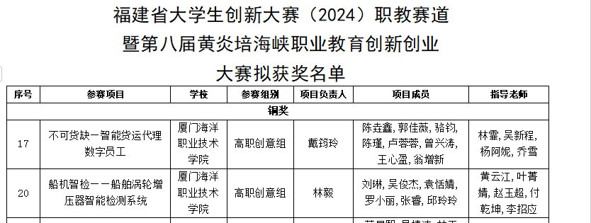 近日,福建省教育厅网站公示了福建省大学生创新大赛(2024)职教赛道暨第八届黄炎培海峡职业教育创新创业大赛的拟获奖名单,我校师生获高职创意组铜奖2项。
