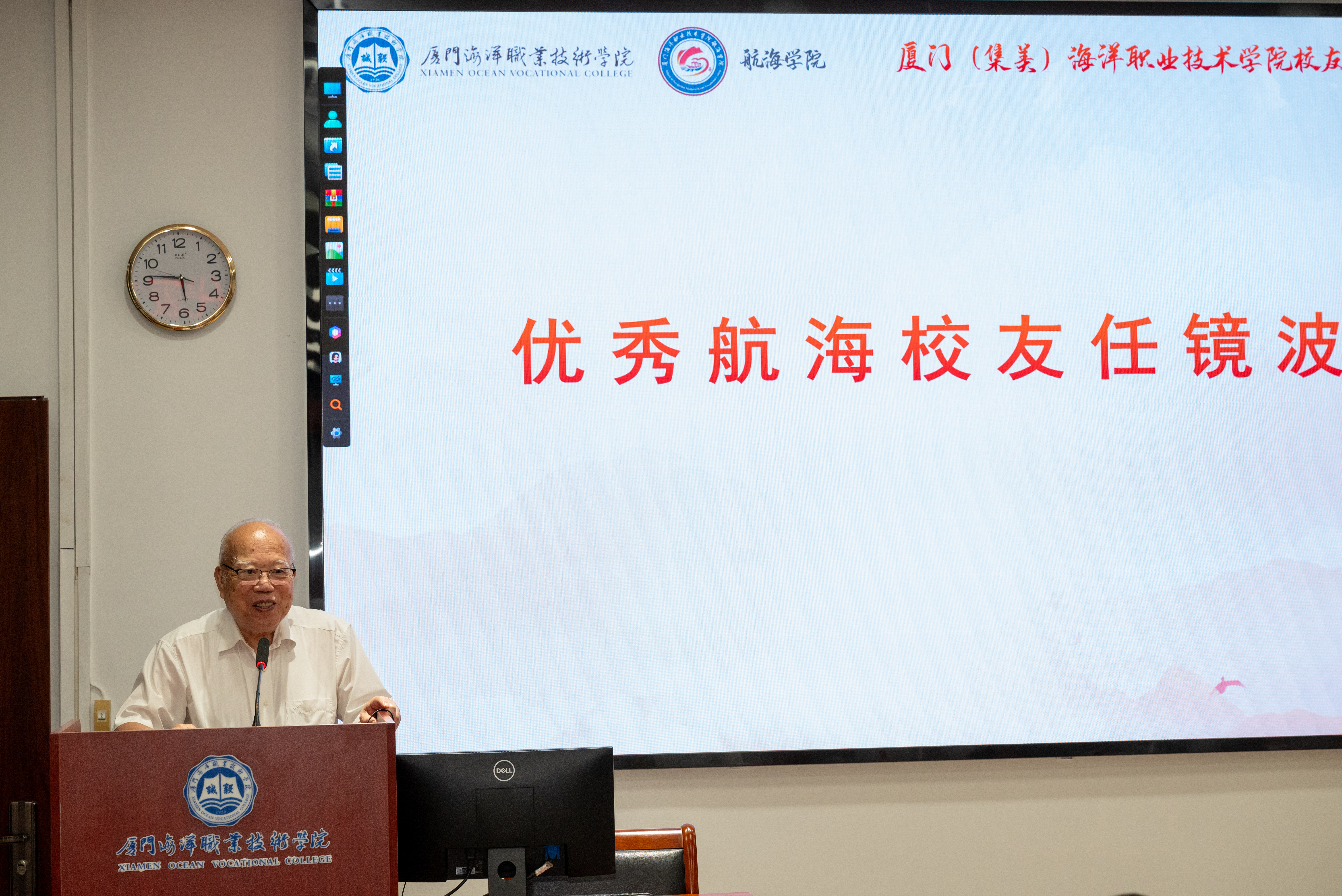 杰出的航海校友任镜波先生致辞,他回顾了自己在嘉庚学校求学经历,通过三个与嘉庚先生的难忘故事,让与会会员们对校主的“爱生如子、‘诚毅’校训”感同身受。任镜波回顾自身践行习近平总书记给集美校友总会回信精神,光大嘉庚事业的校友会工作经历,强调要发扬陈嘉庚先生爱国兴学精神,发挥校友会的功能和作用,助力母校发展。