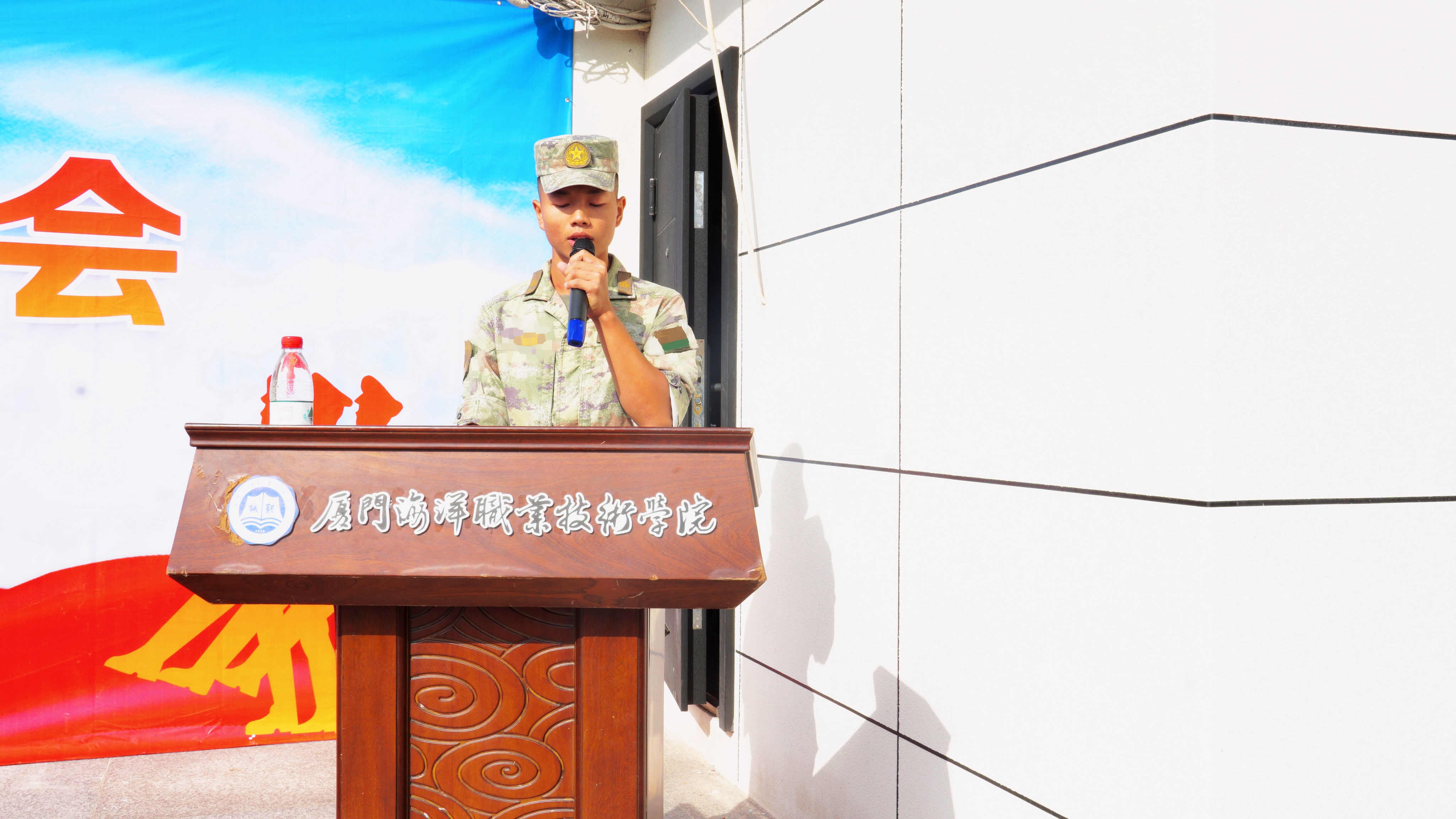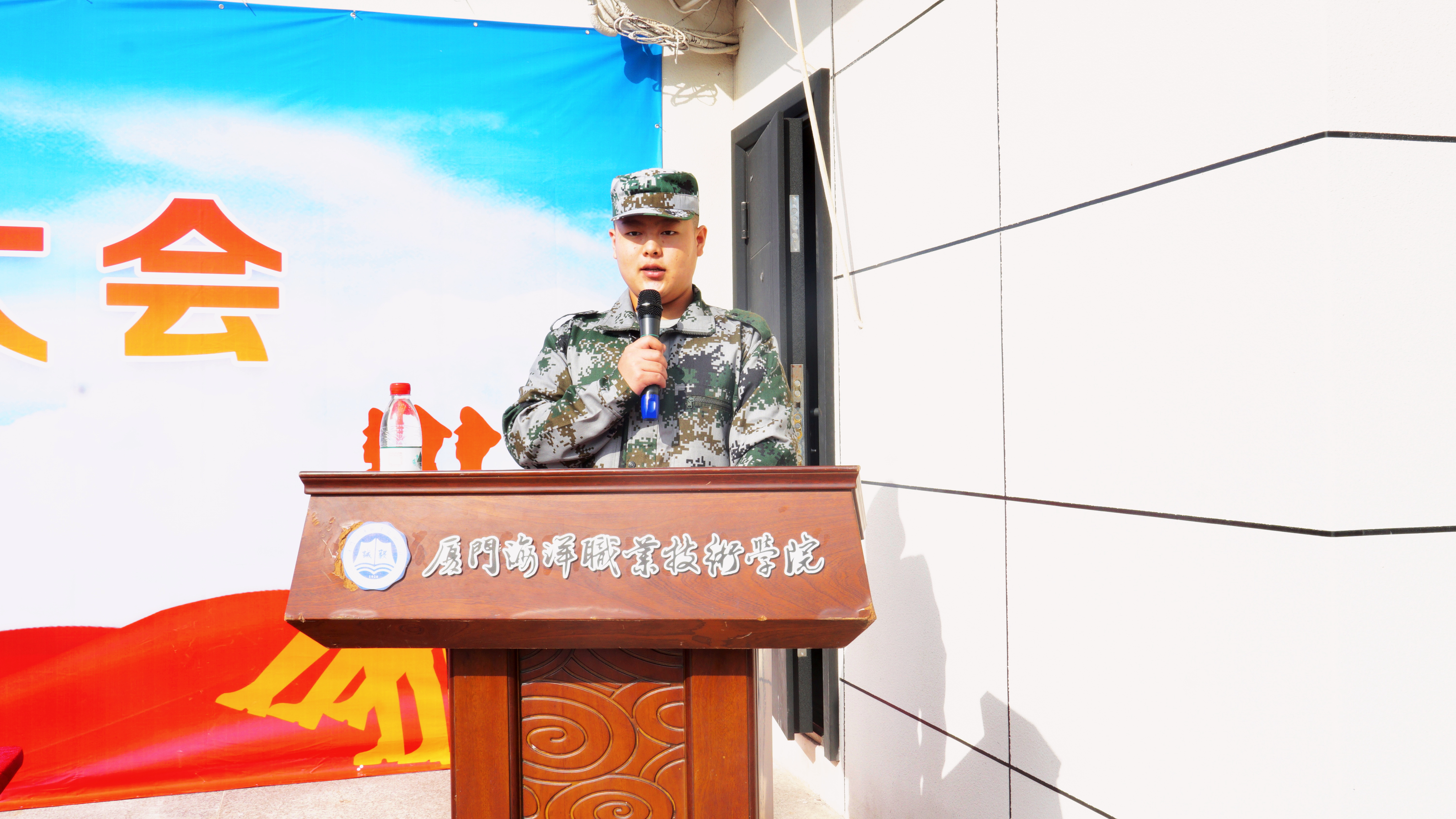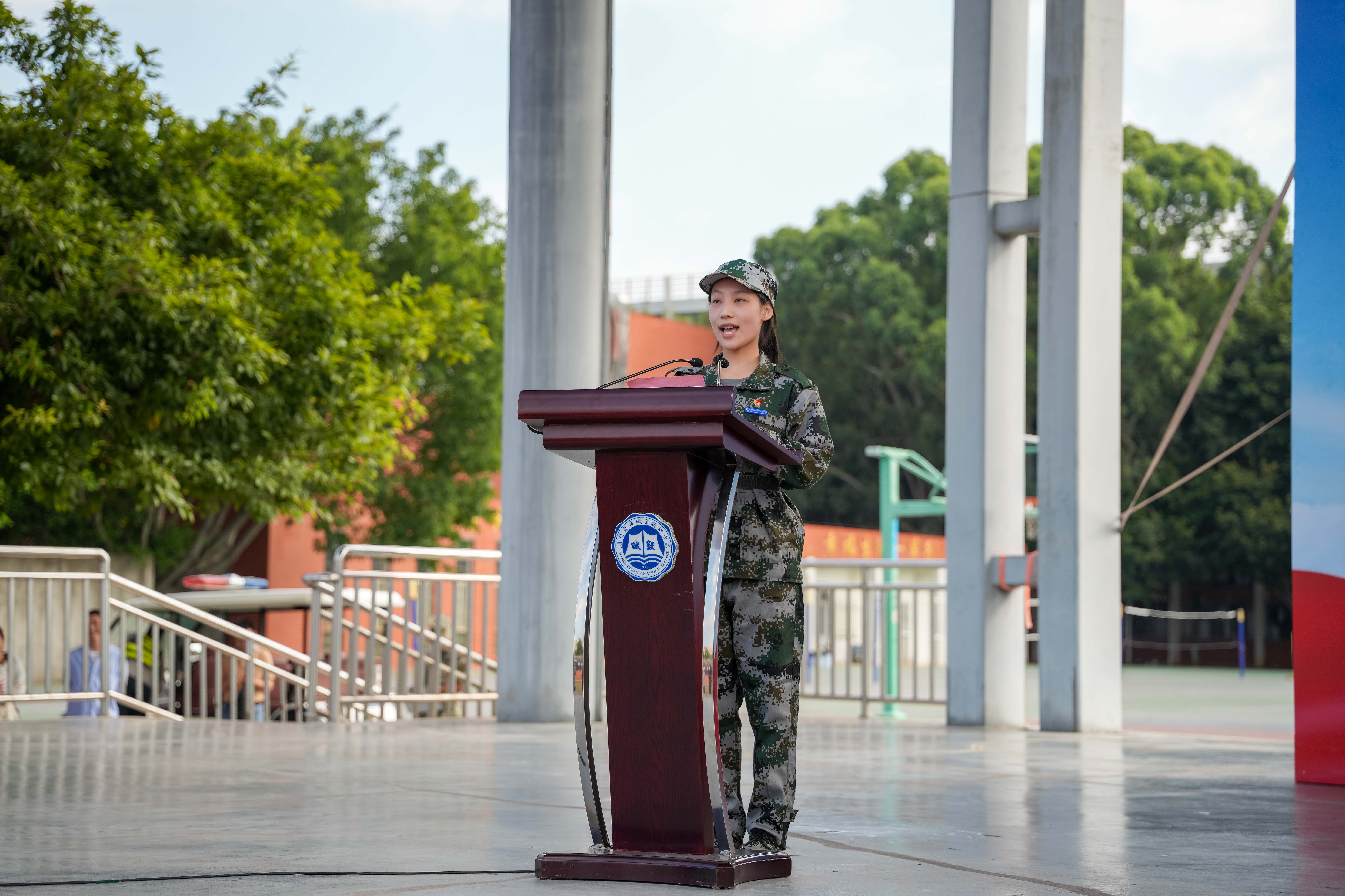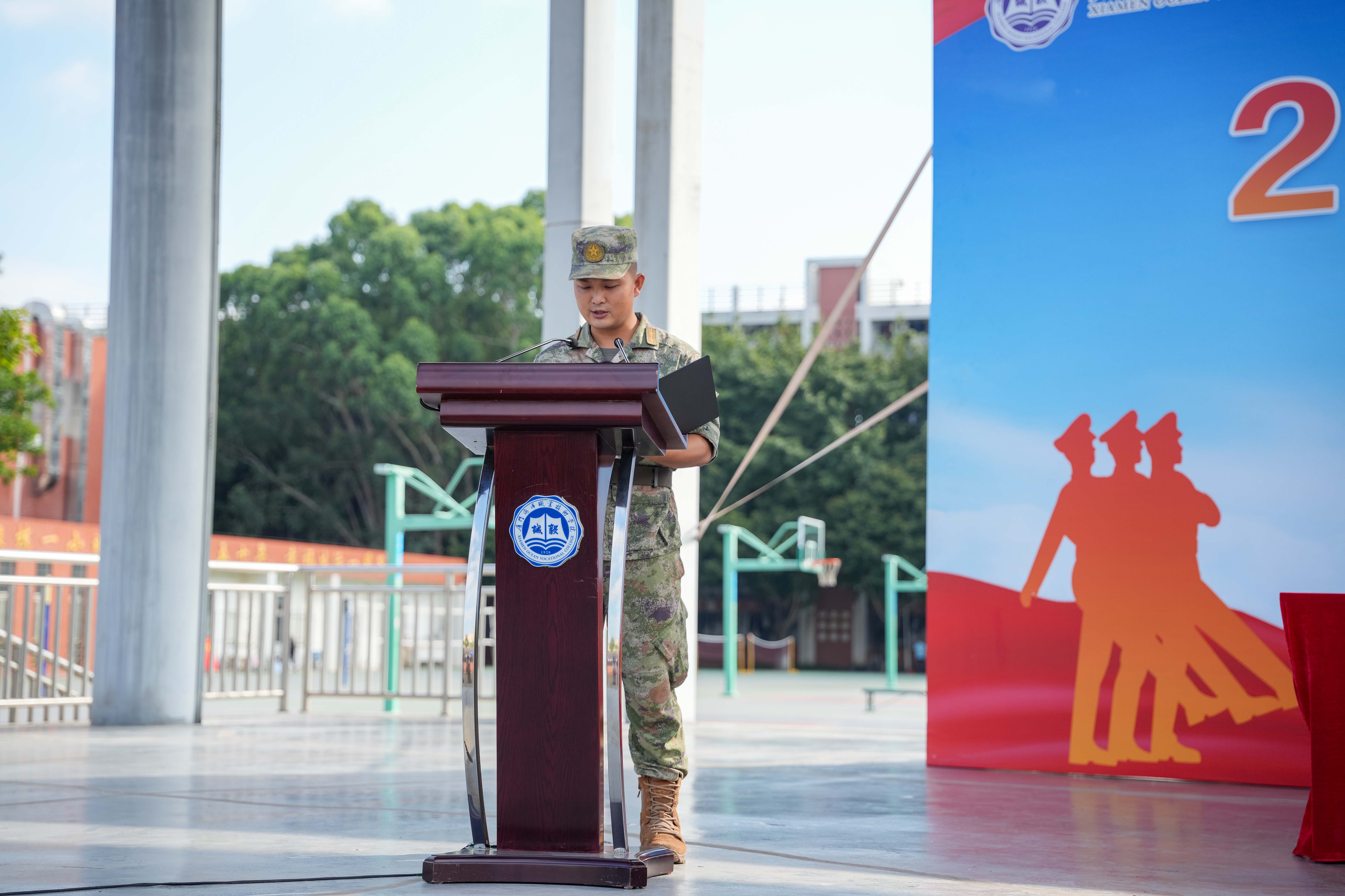 海洋生物学院赖欣悦、航海学院张忠赫作为参训学生代表发言,他们代表全体参训学生承诺:尊重教官、服从命令、团结协作、刻苦训练,发扬“能吃苦,能战斗”的军旅作风,在青春赛道上跑出真我风采。