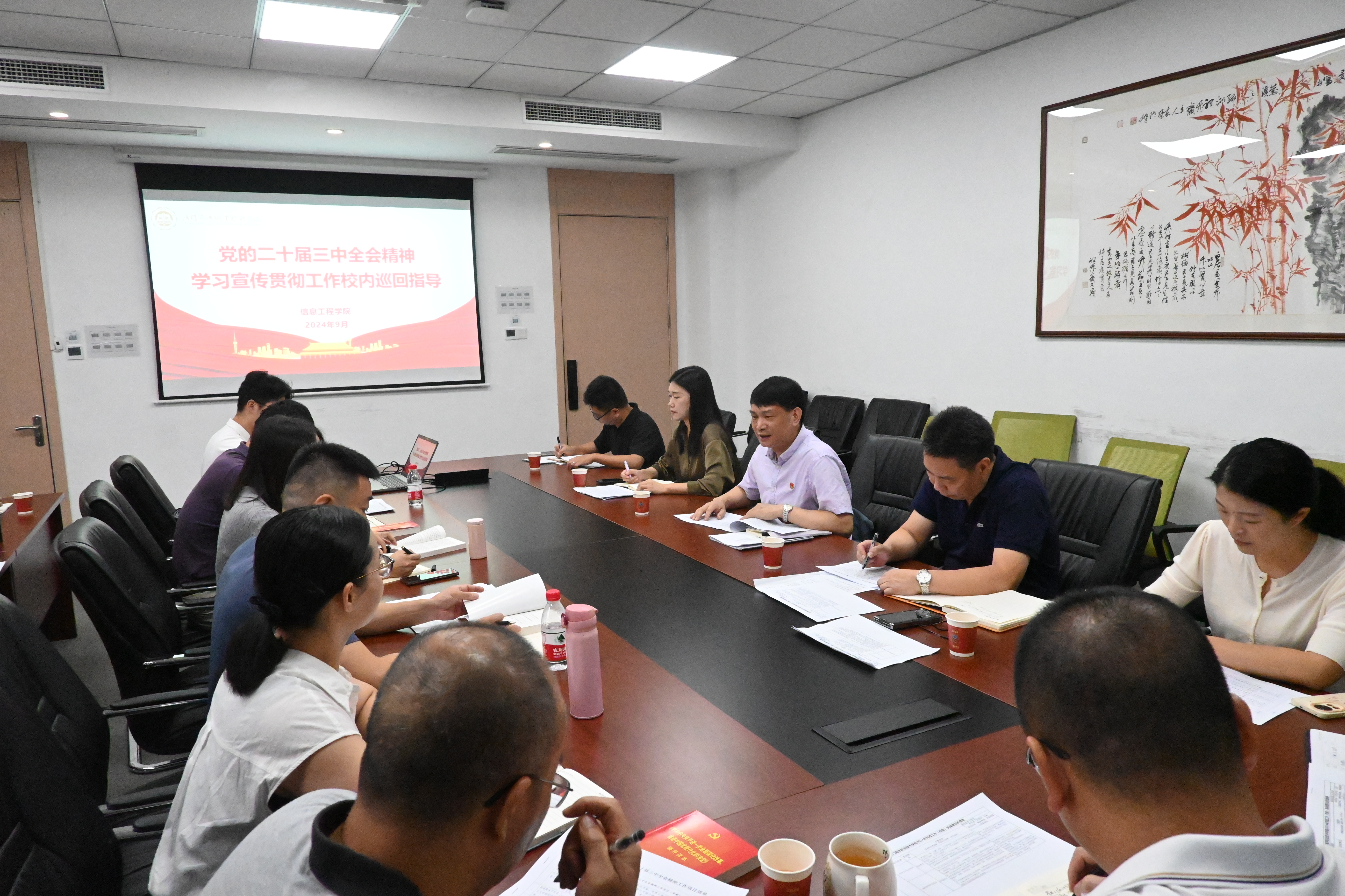 信息工程学院党总支书记谢世煊对照《中共中央关于进一步全面深化改革、推进中国式现代化的决定》,汇报了信息工程学院学习贯彻落实党的二十届三中全会精神的基本情况。信息工程学院副院长郭健对标2024年党政工作要点汇报了信息工程学院坚持党建引领,聚焦专业建设,探索融合融汇等工作开展情况。与会部门就相关工作进行交流。