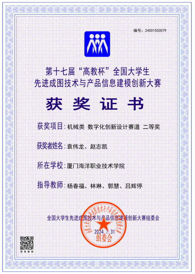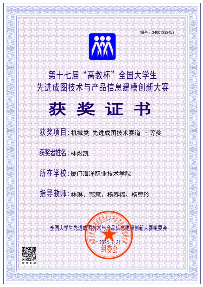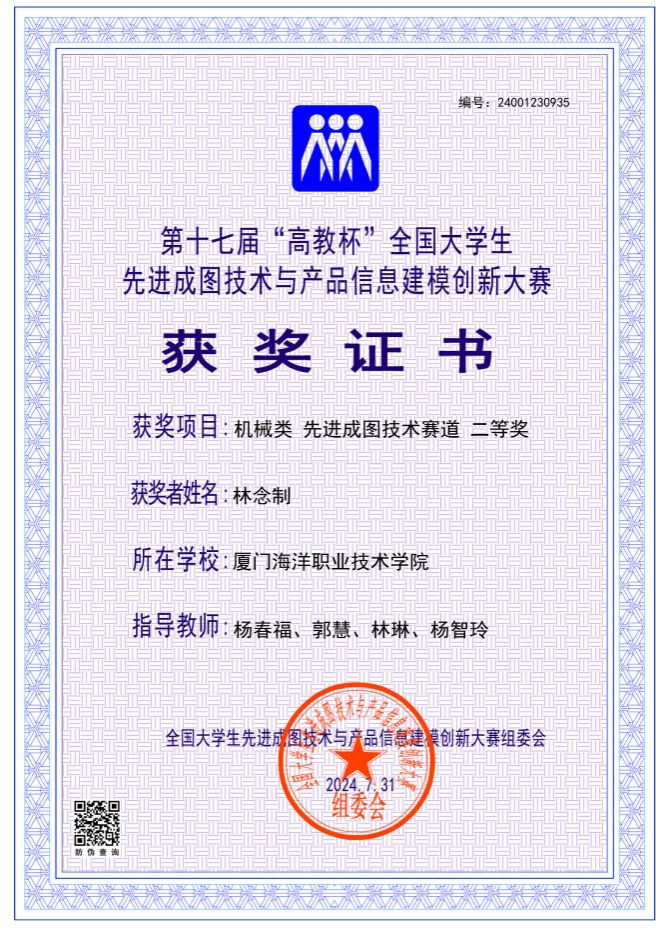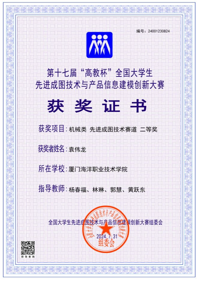 海洋机电学院11位同学参加了机械类4个赛道的比赛,最终荣获先进成图技术赛道一等奖1名、二等奖2名、三等奖2名,数字化创新设计赛道二等奖1组、三等奖1组,团体荣获二等奖。