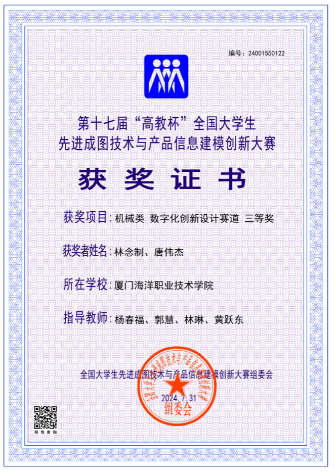 海洋机电学院11位同学参加了机械类4个赛道的比赛,最终荣获先进成图技术赛道一等奖1名、二等奖2名、三等奖2名,数字化创新设计赛道二等奖1组、三等奖1组,团体荣获二等奖。