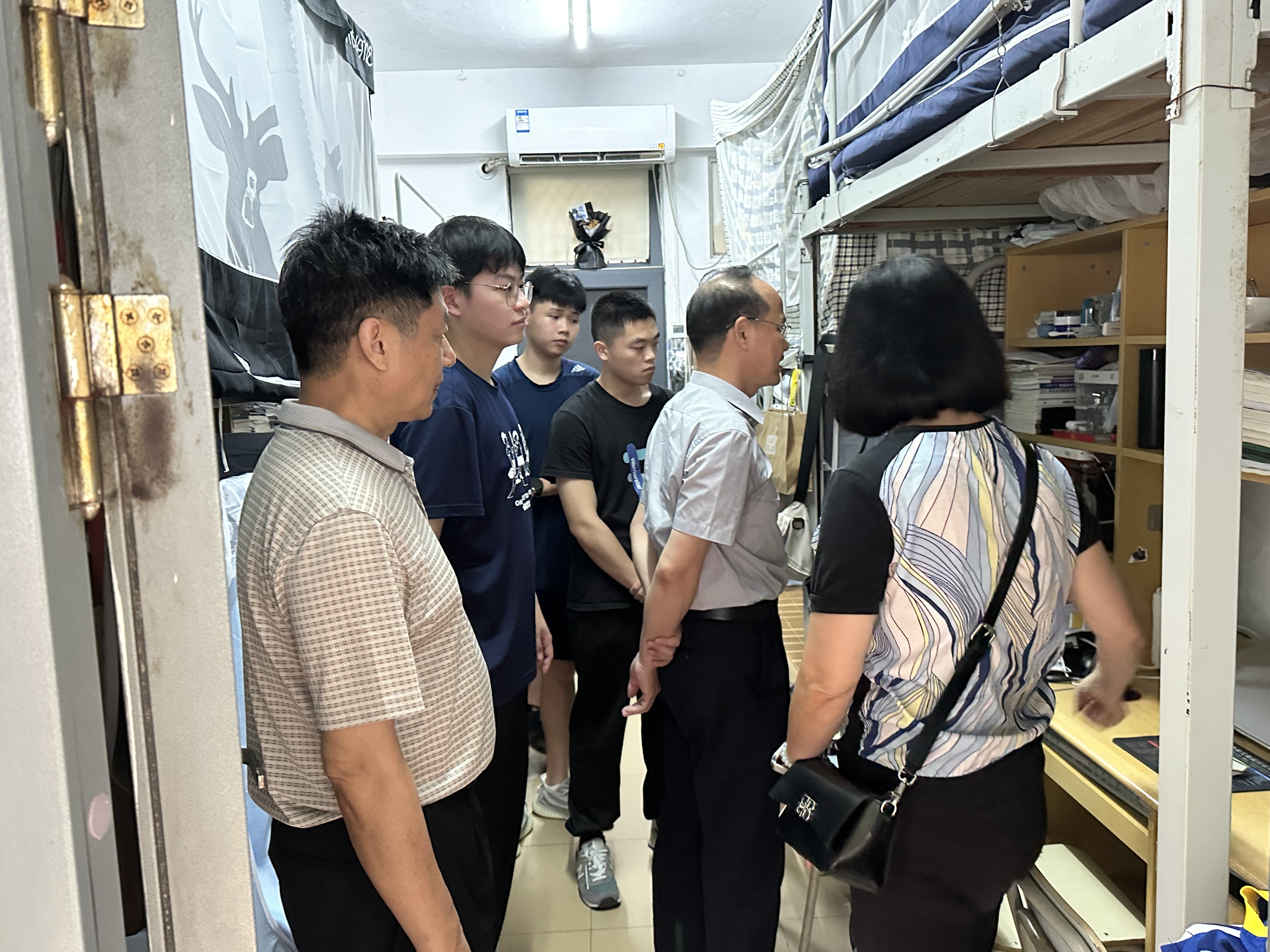 随后,马国玄一行走访学生宿舍,检查学生宿舍用电安全、消防设施、物资设施,提醒同学们要增强安全防范意识,高度重视用电安全、消防安全和人身财产安全,保持良好的卫生环境,共同营造一个安全、温馨的宿舍环境。