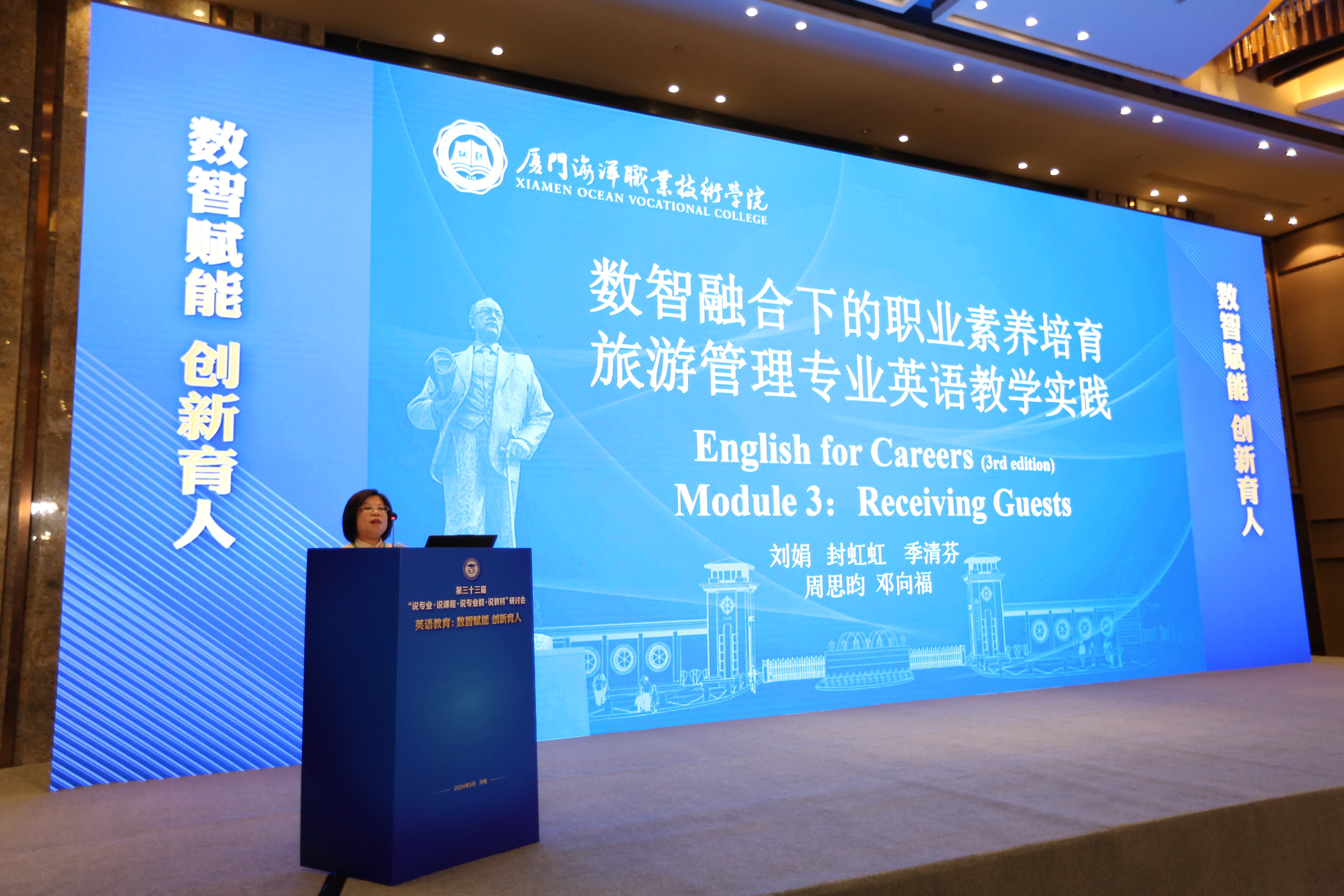 我校刘娟老师申报的《数智融合下的职业素养培育:旅游管理专业英语教学实践》“说教材”案例入选典型案例,她受邀在研讨会上做交流分享。刘娟老师根据《高等职业院校专科英语课程标准2021版》,结合我校旅游管理专业人培目标,精心挑选“十四五”国规教材《新职业英语》,充分结合职场情境和旅游管理专业岗位需求进行课程重构。以模块三:Receiving Guests“客户接待”为例,从教学目标、教学设计、教学评价、特色与创新等方面阐述如何利用数智技术合理、科学、有效使用教材,培养学生职业素养,并从该单元中选取最具特色的教学环节进行了数智融合技术下的听说课堂教学展示。此次案例展示得到了与会专家和同行的认可,这不仅彰显了我校教师的专业素养和创新能力,也体现了我校英语教学团队在教学研究和实践方面的深厚积累。