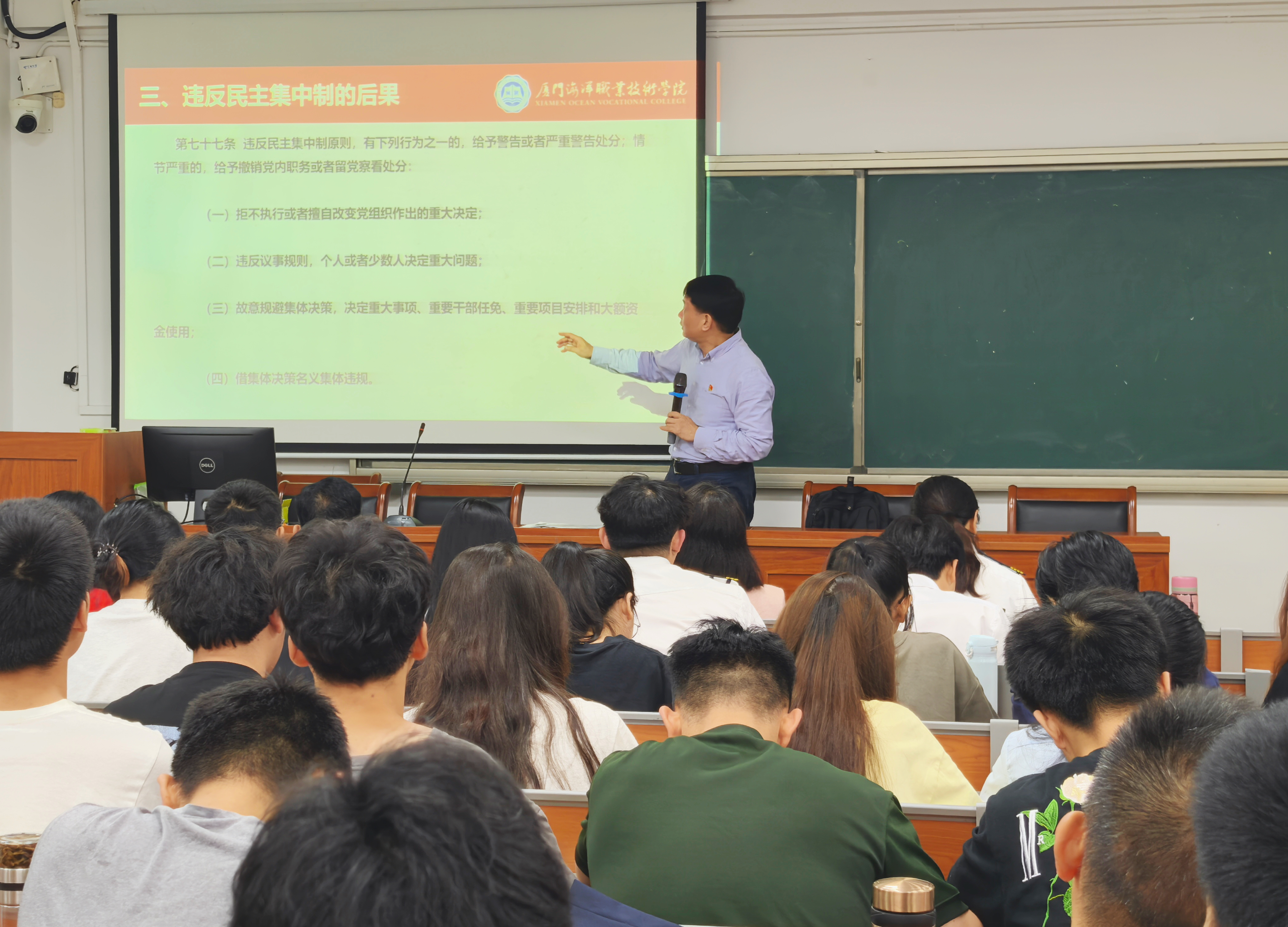 陈一端聚焦新修订的《中国共产党纪律处分条例》第“七十七条”,由点及面地为师生介绍了“权力的应用与制衡”“高校党委领导下的校长负责制”及“违反民主集中制的后果”。他以第“七十七条”为例,充分结合学校实际,为到场师生进行了深入浅出、生动形象的解读。