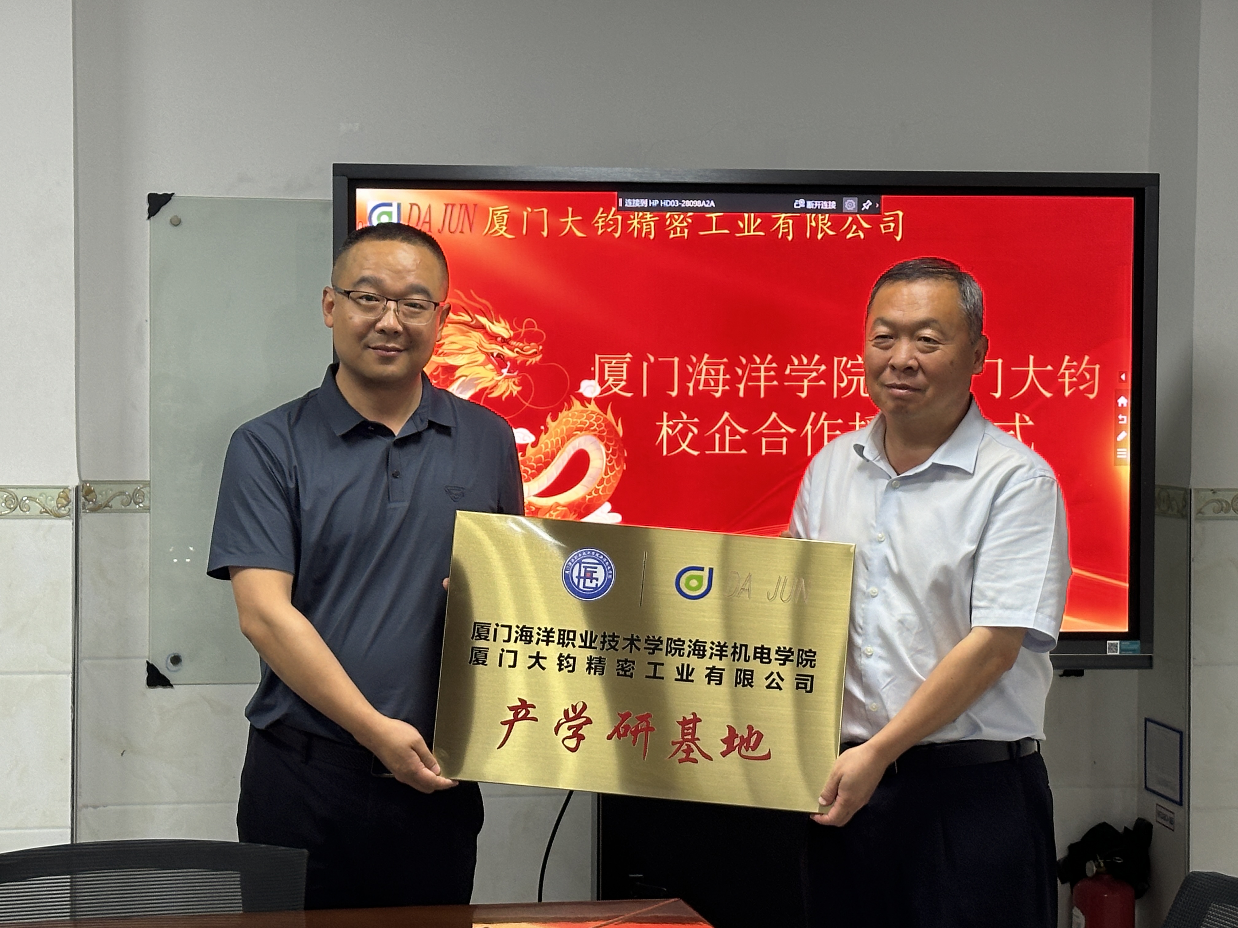 随后,蔡宏伟一行来到厦门大钧精密工业有限公司,听取副总经理姚伟关于公司情况的详细介绍,加深了对该公司发展现状、主营业务、生产线和研发中心等方面的了解。蔡宏伟对公司在科技创新和人才培养方面取得的成果给予高度评价,并表示希望校企合作要向更深层次、更广领域发展,通过共同开展科研项目、共建实训基地、互派师资等方式,实现资源共享、优势互补、合作共赢。随后,双方代表开展产学研基地合作授牌仪式。