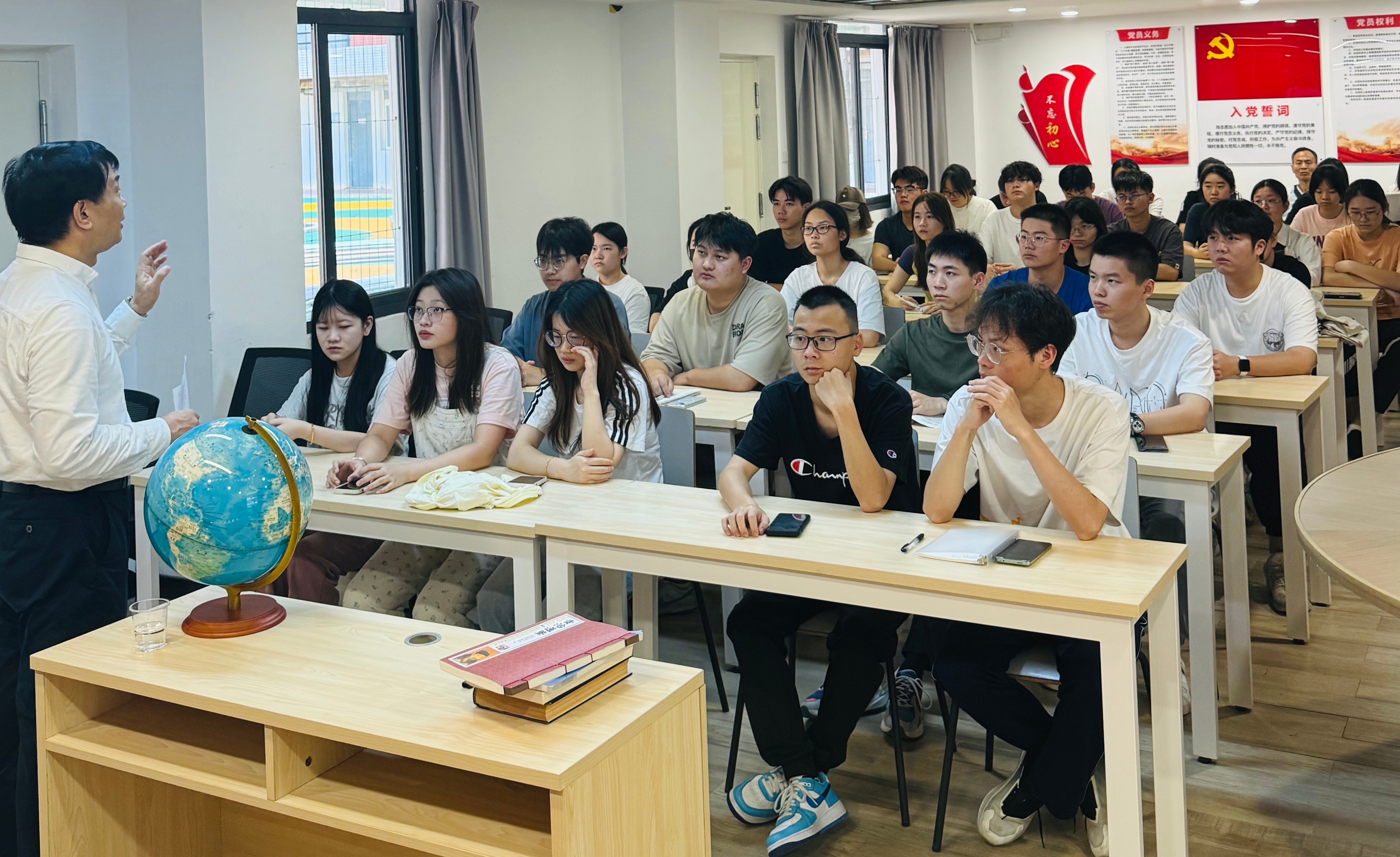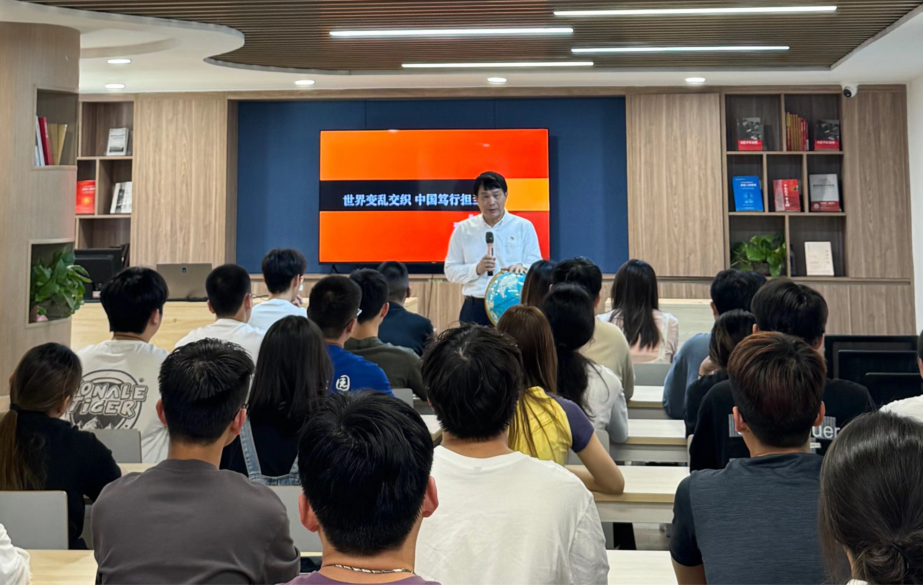 5月8日,党委书记陈一端走进一站式学生社区党群活动中心,以“世界变乱交织,中国笃行担当”为题,为马克思主义学院习近平新时代中国特色社会主义思想读书社、青年马克思主义研读社、嘉庚红·海洋蓝读书社、中共党史读书社生讲授了一堂精彩绝伦的形势与政策课。