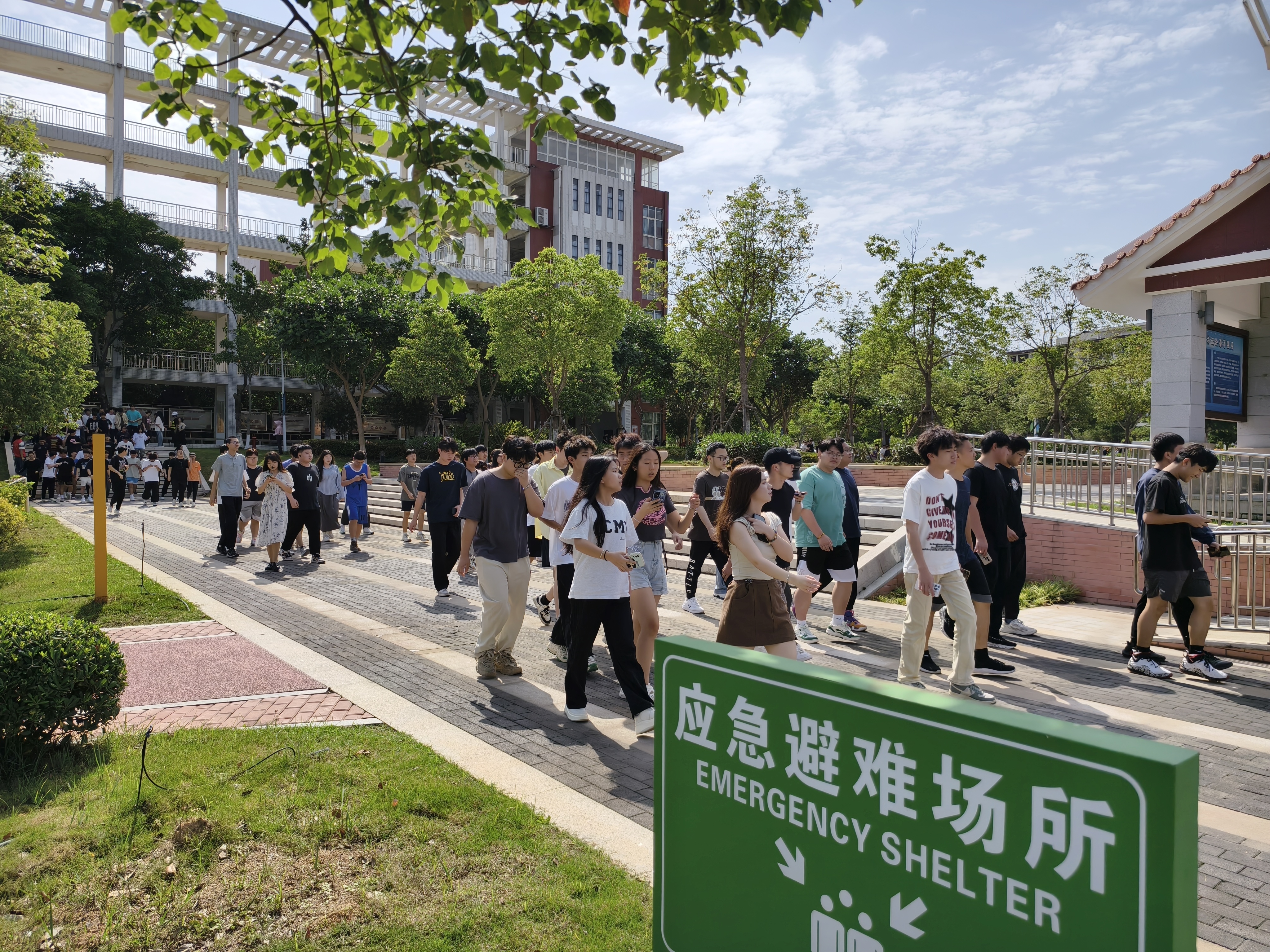 下午3点整,警报声响起,演练开始。教学区全体师生在工作人员的指导下护住头部,弯腰朝室外撤离,大家认真配合,撤离过程井然有序。