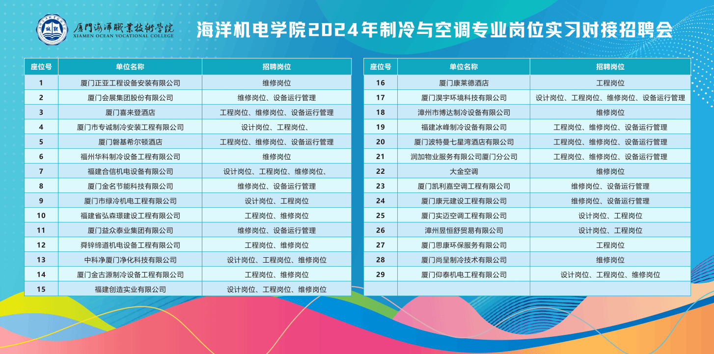 5月14日,海洋机电学院成功举办2024年制冷与空调技术专业岗位实习对接招聘会。此次招聘会吸引了省内30多家知名企业参与,为即将步入实习阶段的学生提供了超过150个实习岗位选择。