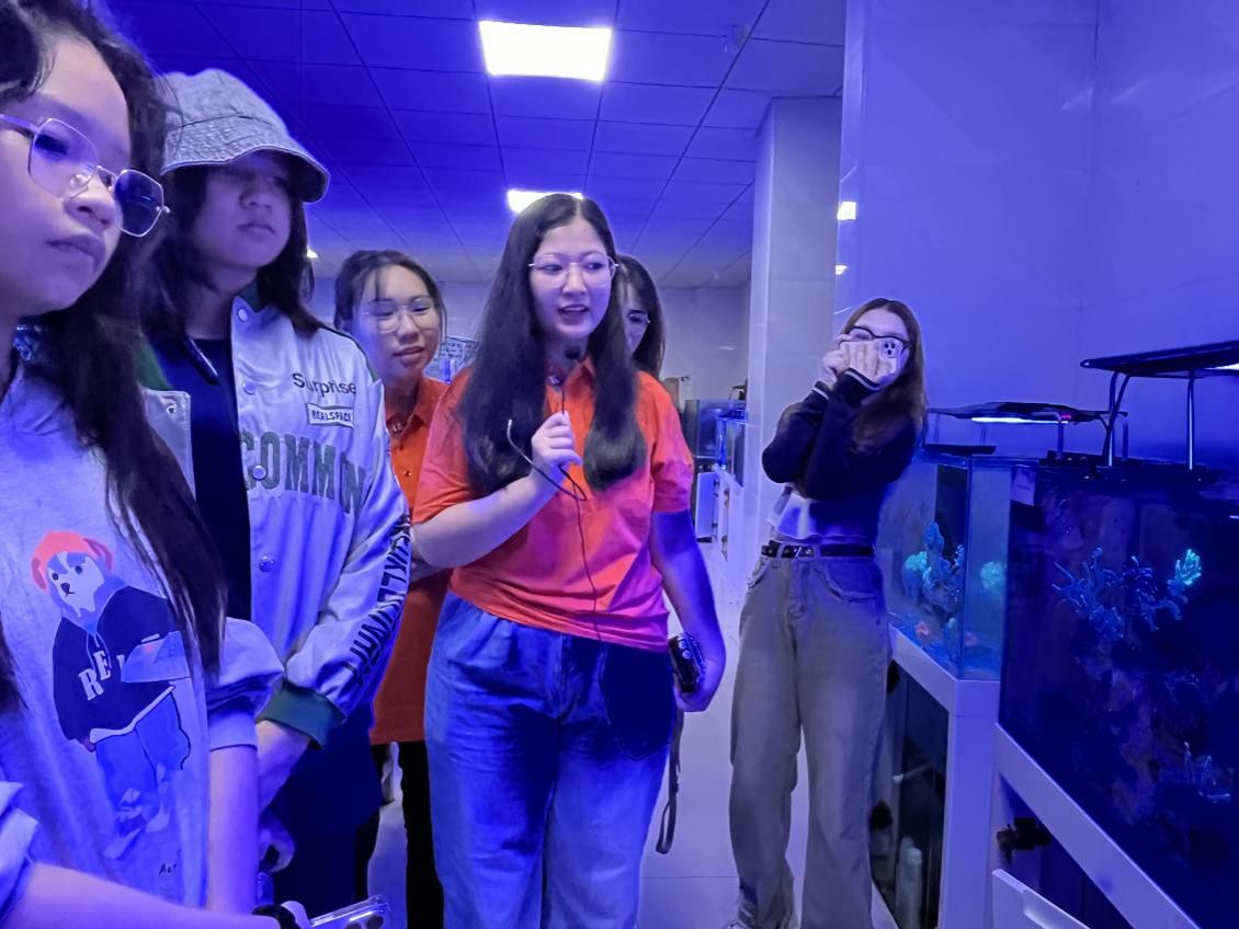我校泰国留学生当起了泰语翻译和讲解员,向体验营的学员们介绍了学校的基本情况,带领着体验营的成员们参观了学校的校史馆和珍稀海洋生物繁育研究中心。