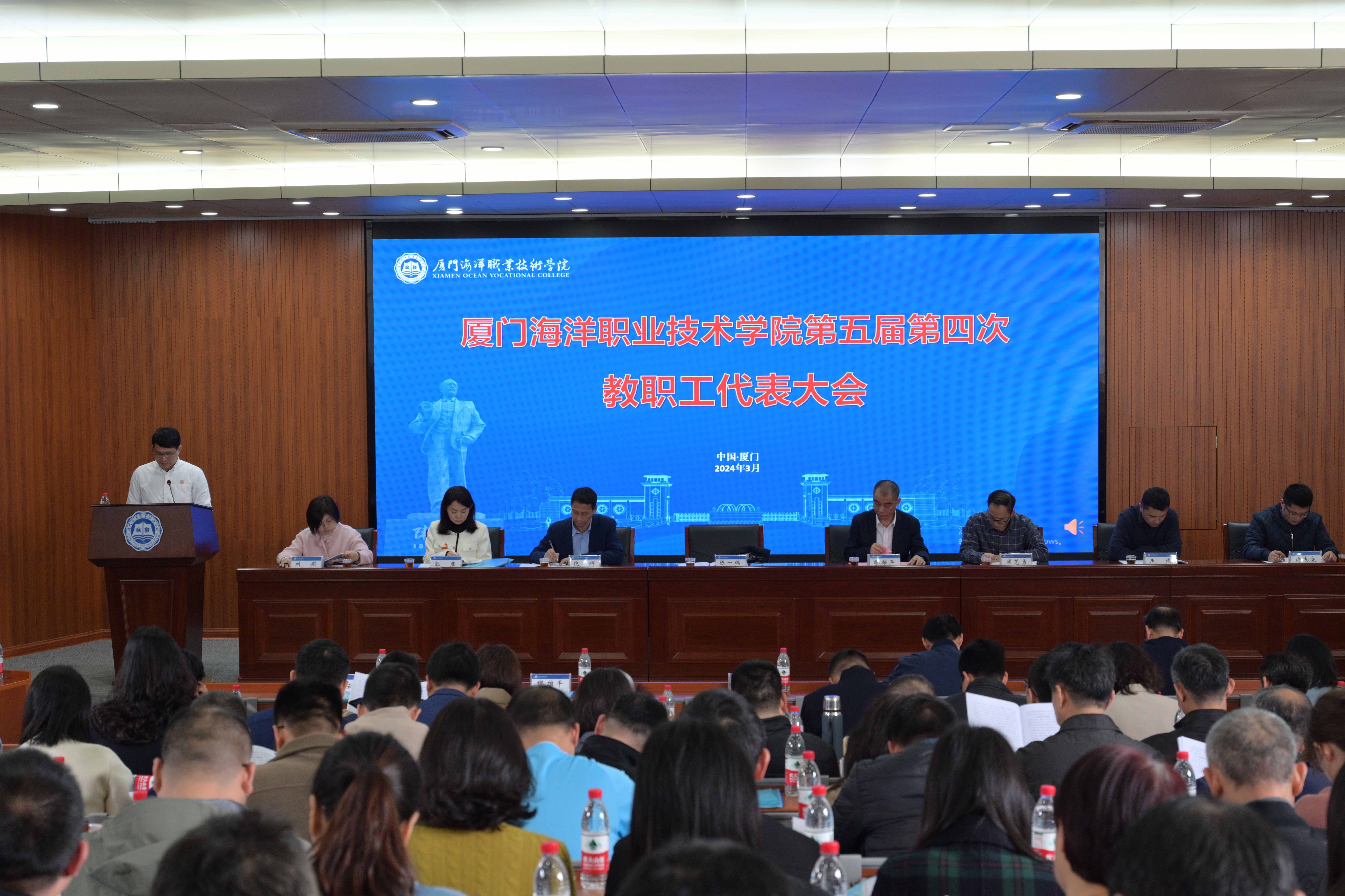 陈一端作《团结起来,为创建厦门海洋职业大学而奋斗》的院长工作报告,回顾总结学校2023年工作成绩,科学谋划、全面部署2024年重点工作,统一思想,凝心聚力。报告指出,2023年是全面贯彻党的二十大精神的开局之年,学校坚持以习近平新时代中国特色社会主义思想为指导,坚持党对学校工作的全面领导,落实立德树人根本任务,一体推进升本创建等重大项目建设,创建海洋职业大学取得突破性进展;全面推进“大思政课”建设,加快构建更具海洋特色专业体系和“蓝色工匠”人才培养,获国家级教学成果奖二等奖,实现历史性突破;加快建设高水平师资队伍,实施“嘉庚学者”人才支撑计划,实现教师创新团队入选国家级职业教育教师教学创新团队的重大突破;持续凝练深化嘉庚精神、海洋文化等校园文化特色,成功承办第二十四届中国高校“校长杯”羽毛球比赛等重大活动会议;创新产教融合科教融汇模式,加强科研创新与服务,打造特色社会服务品牌,拓展对外合作交流维度,学校各项事业迅速发展。