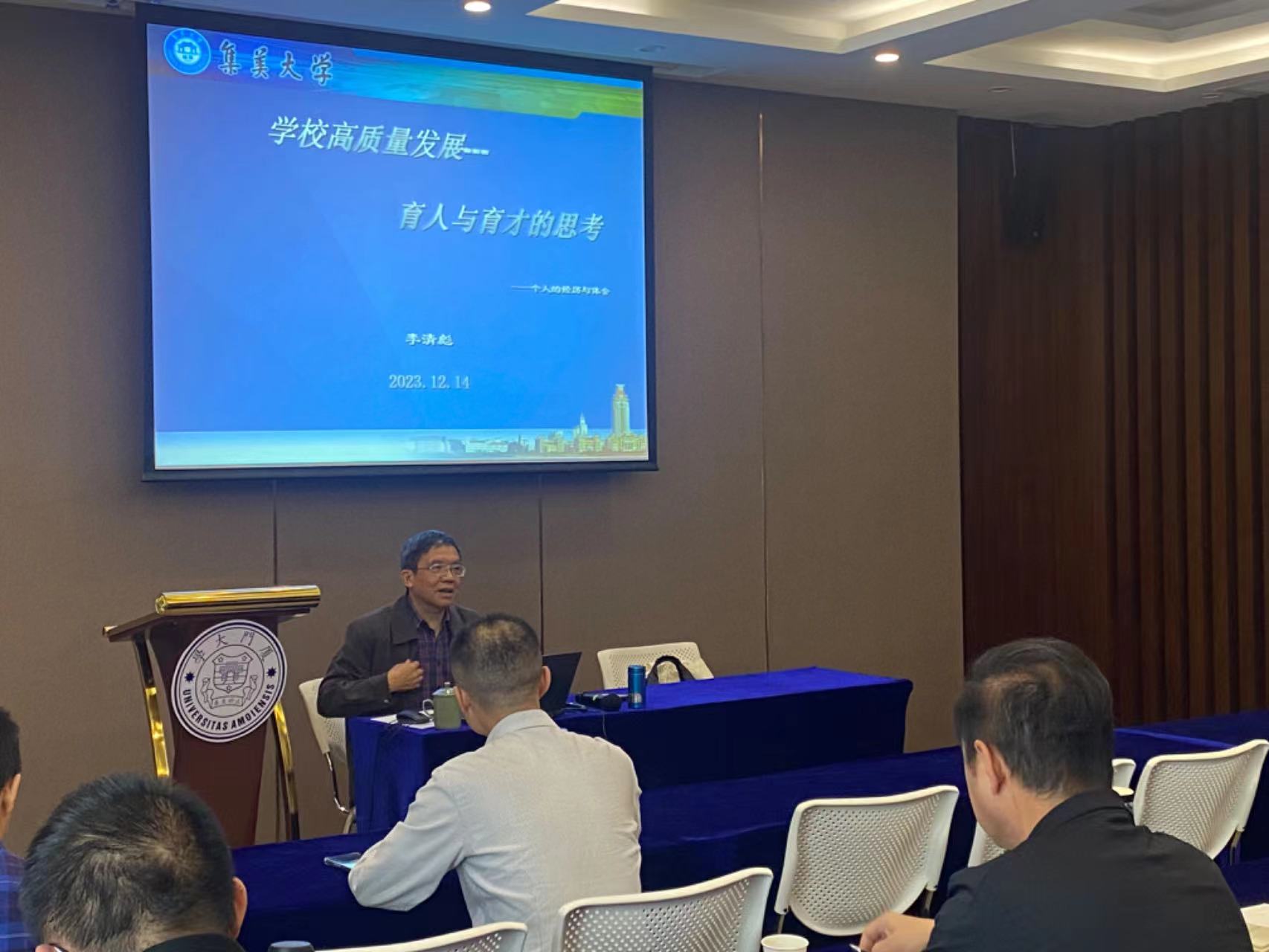 此次培训为期三天,邀请了厦门大学原台湾研究院院长刘国深教授、集美大学原校长李清彪教授等专家学者,从台海局势与国家统一前景、教育数字化转型背景下教研成果的提炼与转化、科研项目申请与实践、如何上好一堂课等不同专题为学员们进行了精彩的讲座。本次培训是按照人事处(教师工作部)年度计划安排举办的,旨在拓宽教师视野,提升自身教学、科研能力,让参训教师学有所获、学以致用,提高教师专业发展水平,促进教师队伍内涵建设。