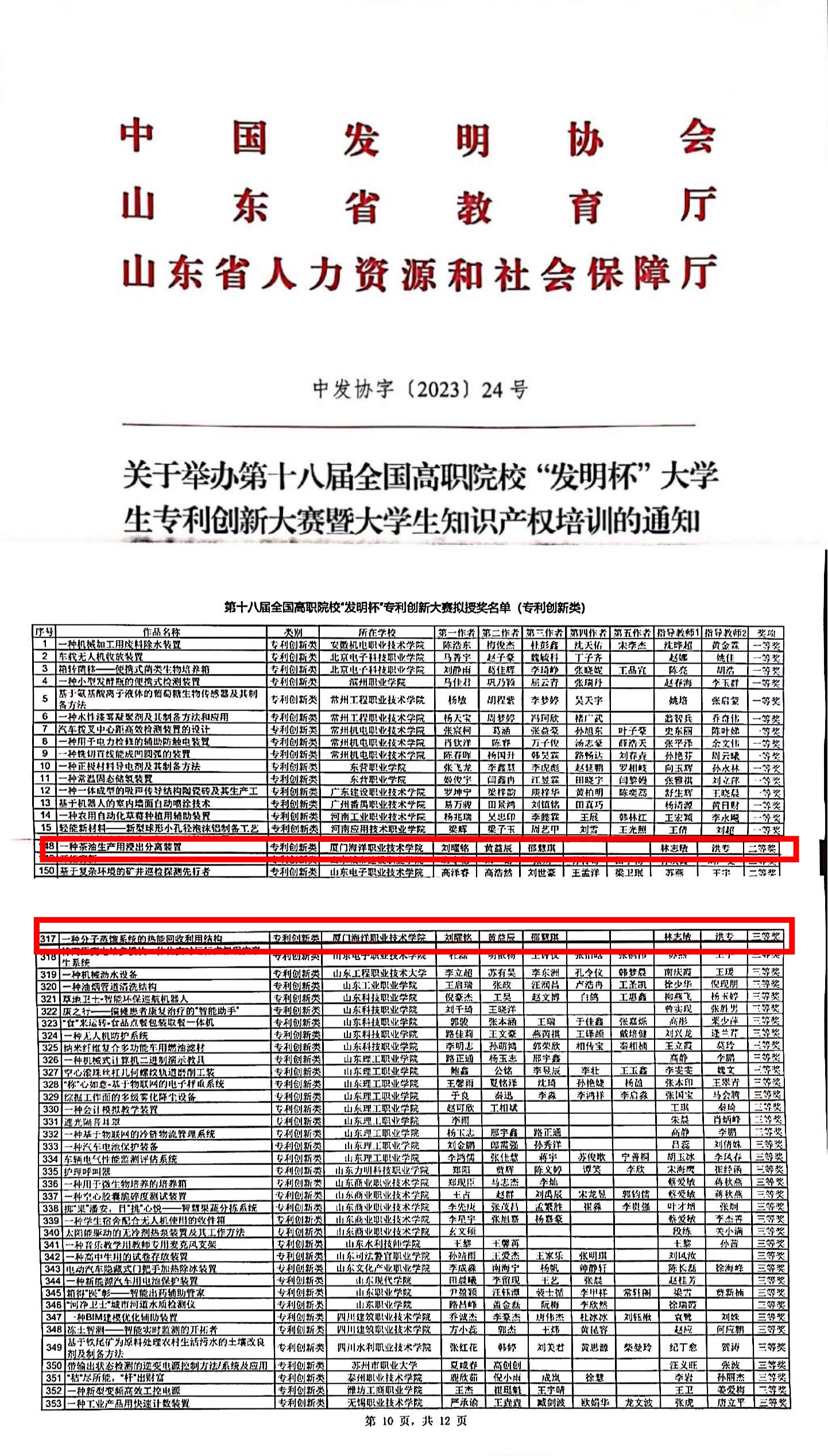 日前,由中国发明协会、山东省教育厅、山东省人力资源和社会保障厅共同主办的第十八届全国高职院校“发明杯”大学生专利创新大赛结果揭晓。我校选送的学生团队项目《一种茶油生产用浸出分离装置》(专利创新类)荣获全国二等奖,项目《一种分子蒸馏系统的热能回收利用结构》(专利创新类)荣获全国三等奖。