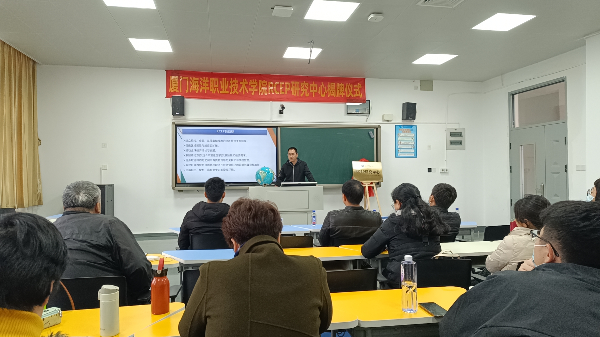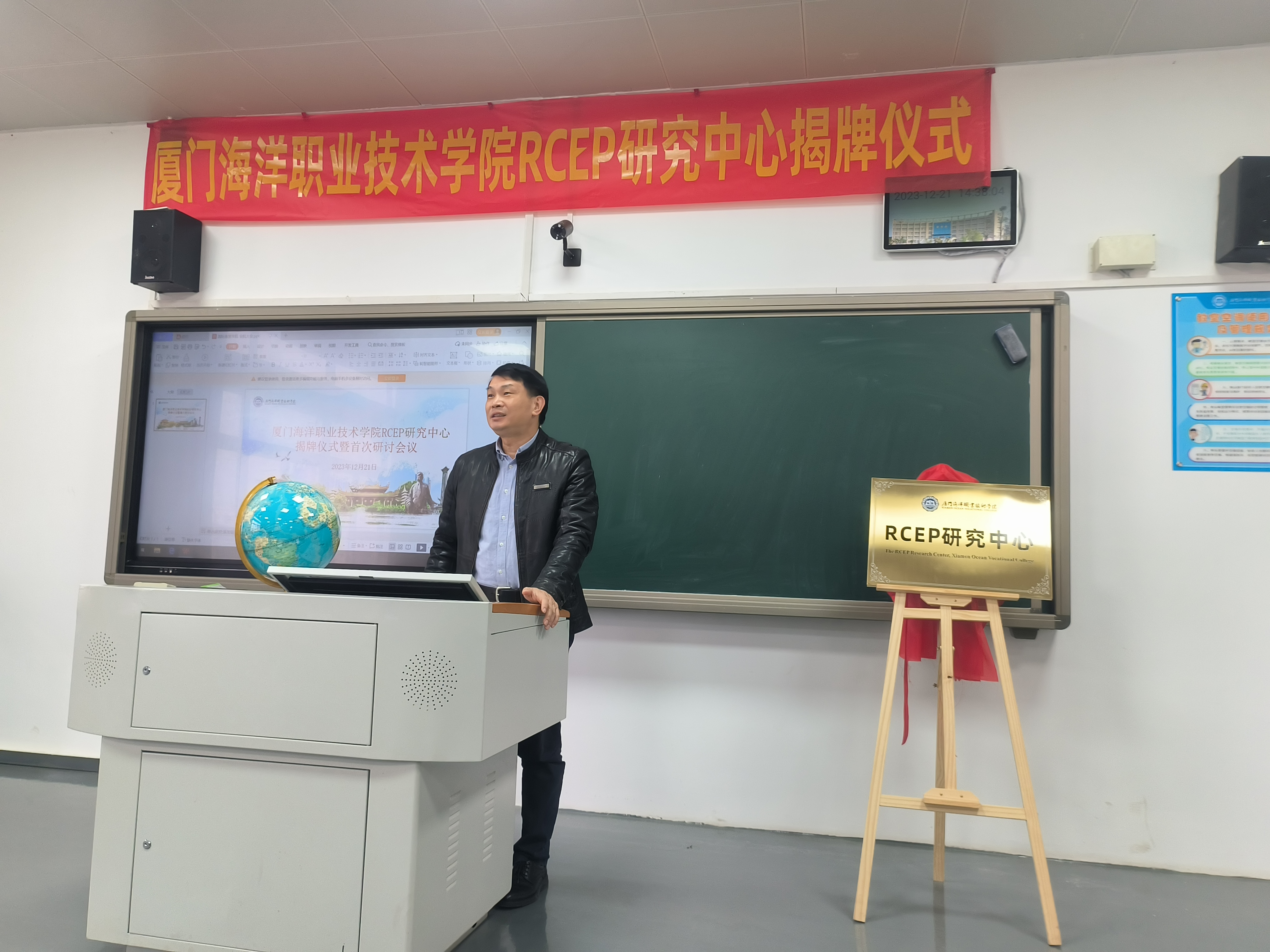 12月21日,厦门海洋职业技术学院RCEP研究中心揭牌成立。党委书记陈一端对RCEP研究中心进行揭牌并讲话。他指出,国际商贸学院全体老师要重视和聚焦RCEP研究,既要注重教学相长,也要注重教研相长,将RCEP研究中心做成文科重要的科研平台。他还对研究中心的运作和研究方向作了重要指示,鼓励教师们充分开展学术研究,为区域经济发展献计献策。