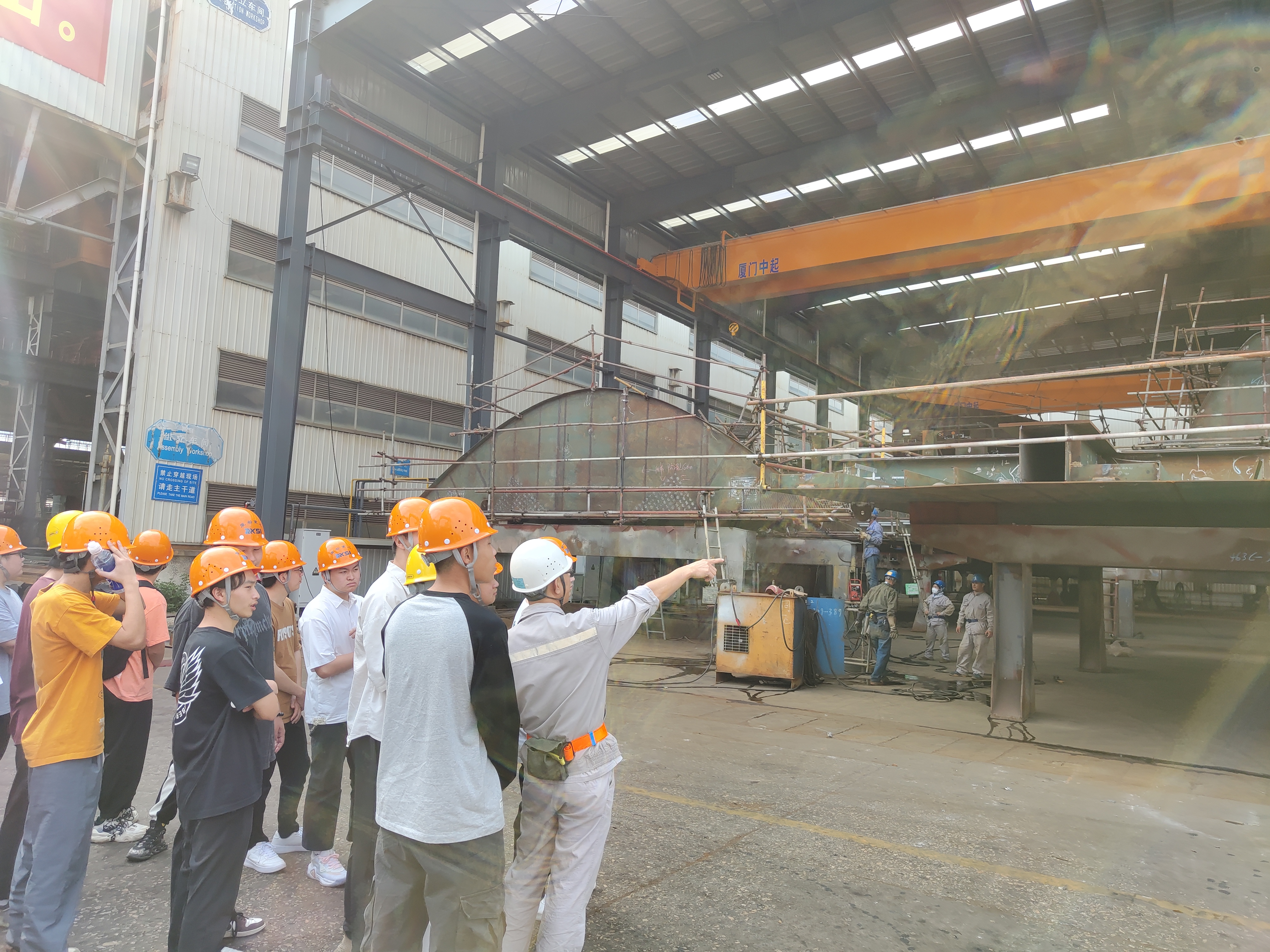 在进入船舶建造工厂之前,解说员给同学们做了细致的安全教育,一一列举地面、半空、空中的危险源,让同学们充分感受到企业“安全致上”的经营理念。