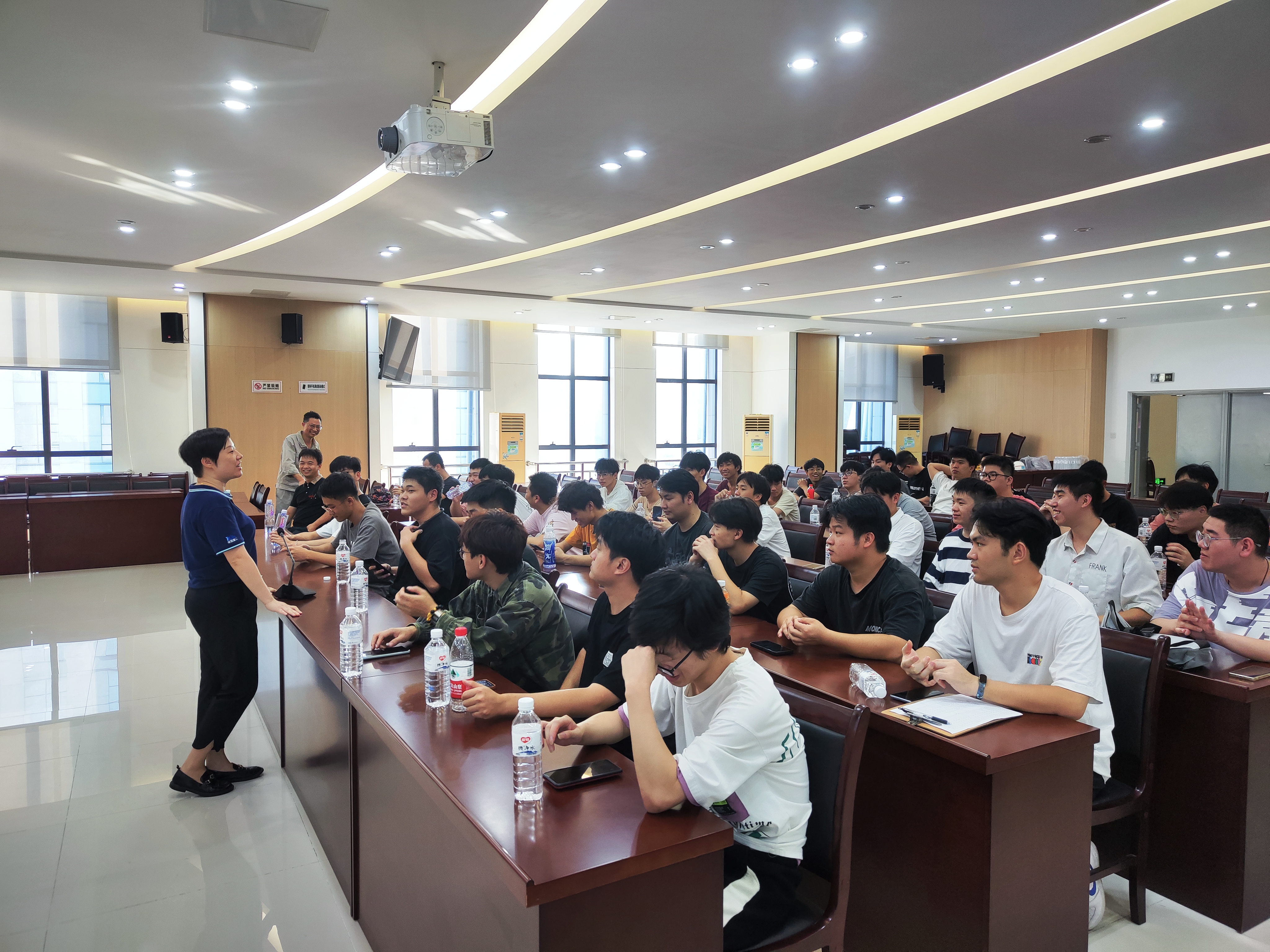 最后,叶松副部长与人事专员赵晨跟同学们做互动交流。人事专员赵晨向同学们详细介绍了公司的发展历程、经营范围、产品情况、装备情况及远景规划,并从企业文化、厂区概貌、住宿情况、福利待遇等方面做了详细说明,并针对我校的校招岗位的工作内容和发展通道作了特别介绍。互动问答环节,两位负责人分别对同学们提出的问题进行答疑解惑,对同学们关心的企业用工性质、职业发展方向、岗位要求、上岗时间等问题一一认真解答。