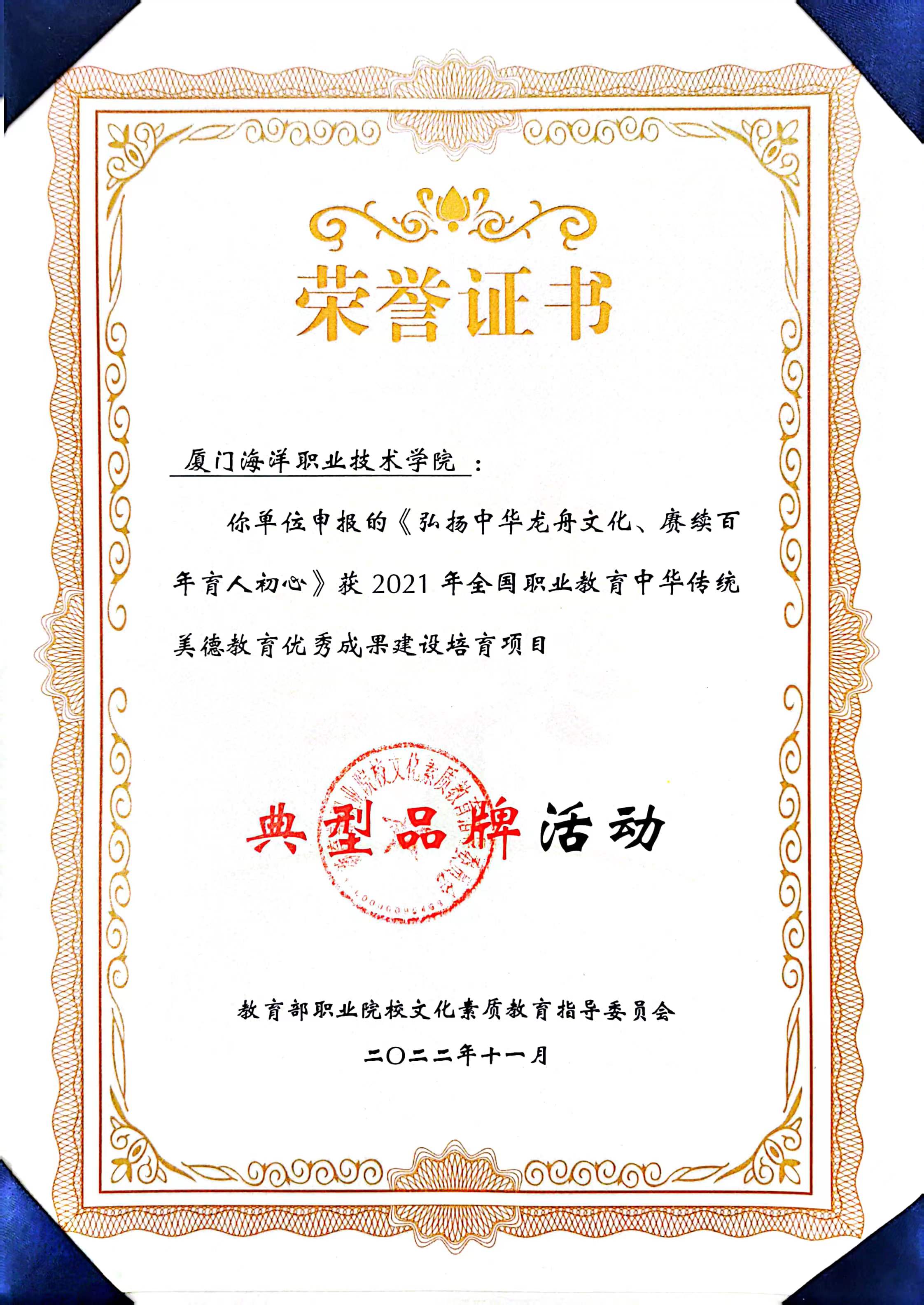 学院长期重视龙舟文化培育,精心开展龙舟运动品牌建设。龙舟运动成为学校传承中华优秀传统文化的特色育人项目及弘扬嘉庚精神的重要载体,获评全国高职院校体育工作 “一校一品”(龙舟运动)示范基地、福建省高校中华优秀传统文化传承基地,“龙韵凝练嘉庚精神 舟楫传承海洋文化”龙舟帆船文化育人项目获评福建省高校思想政治工作精品项目,《弘扬中华龙舟文化、赓续百年育人初心》获评全国职业教育中华传统美德教育优秀成果建设培育项目。