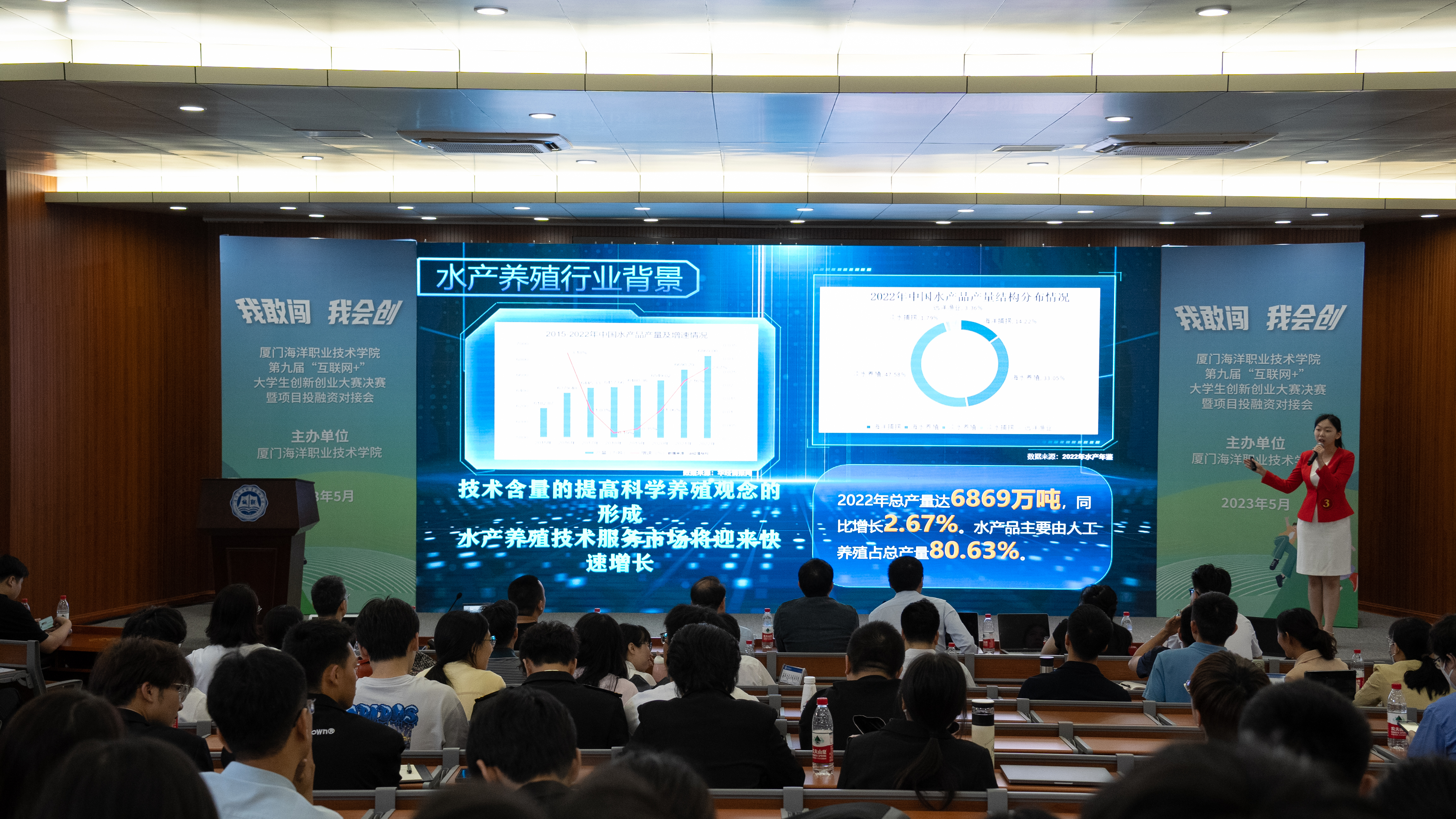 本次大赛邀请了“互联网+”国赛评委、方融科技董事长、前瞻资本合伙人周迪,创赛星(厦门)科技有限公司总经理叶灯烽,厦门首批人社部马兰花SYB创业培训导师韩智源,厦门电影节有限公司金鸡百花创投论坛负责人李尤晏,铂欣资本联合创始人陈晓颜等校外资深双创赛事专家评委,决赛采用项目路演、团队答辩的形式进行。以“我敢闯、我会创”为主题,20支优秀团队围绕项目路演和现场答辩展开了近6个小时的精彩而激烈的角逐。项目展示环节,各参赛团队从产品介绍、市场定位、商业模式、营销策略、财务分析、风险控制、团队结构等内容进行了重点阐述;答辩环节,评委们针对不同项目,从市场定位、创业团队、客户细分、业务现状、成长空间等方面进行提问,并给予许多富有建设性的意见和建议。决赛项目呈现出技术创新性强,海洋特色鲜明的特征,紧密围绕学校产学研创新转化而来,突出我校海洋专业优势,覆盖海洋工程装备、海洋水产养殖、新一代信息技术、非遗文化创意、乡村振兴等多个领域。