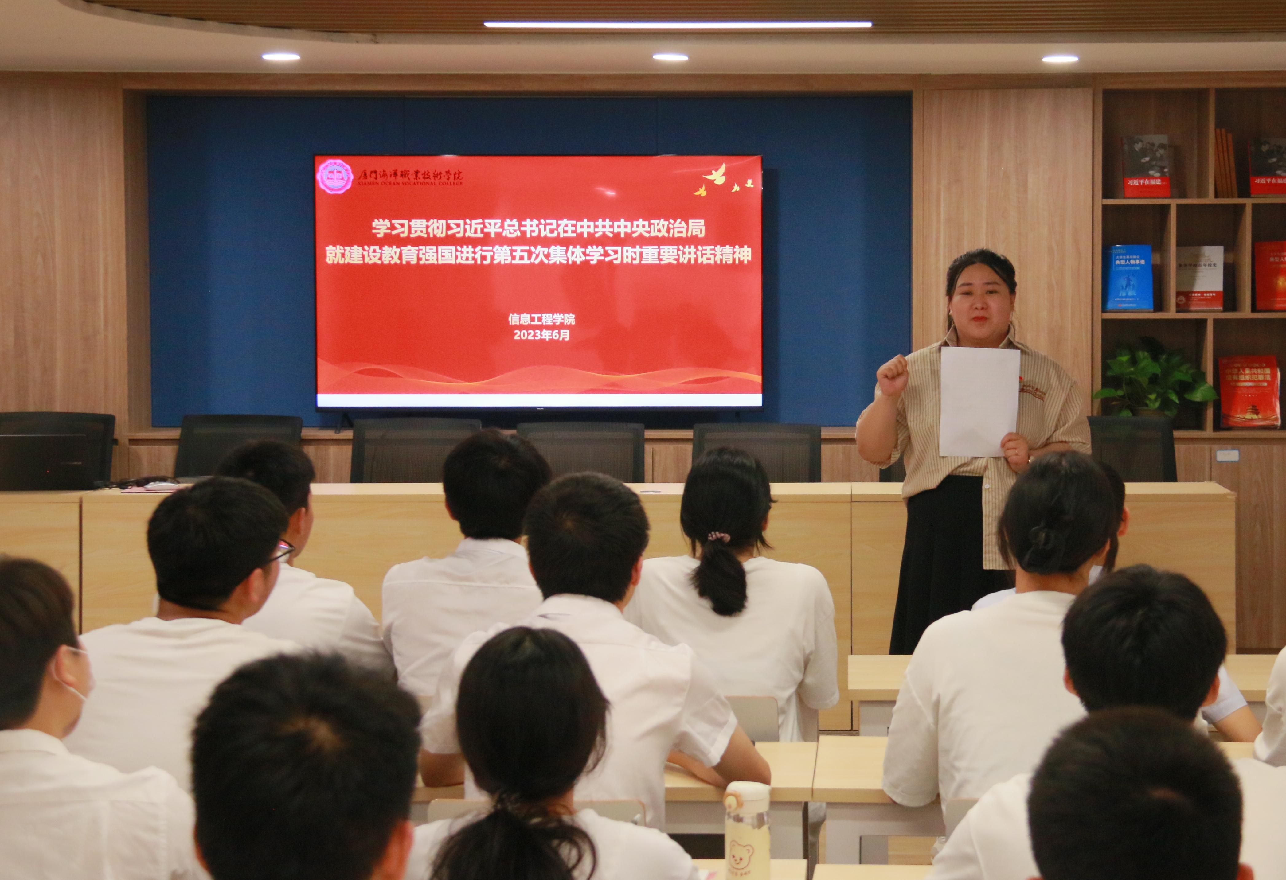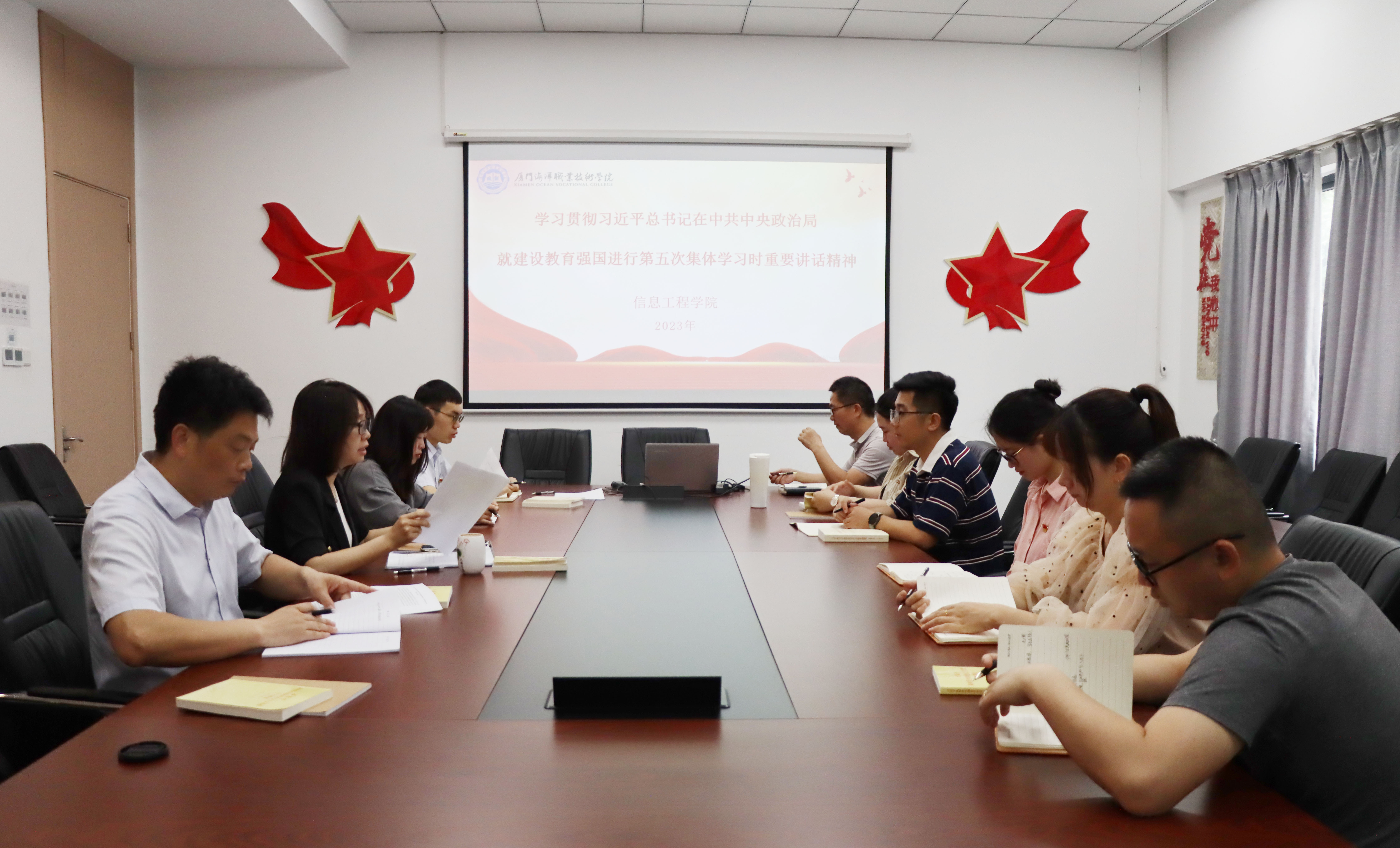 信息工程学院党总支副书记谢世煊主持召开党总支理论学习中心组扩大会议,学习习近平总书记在中共中央政治局第五次集体学习时的重要讲话精神和习近平总书记在北京育英学校考察时的重要讲话精神,进一步深入准确理解习近平总书记关于教育强国的重要讲话精神,充分认识教育在中国式现代化中的历史方位和发展定位,提高对教育强国的认识,进一步增强教育自信。