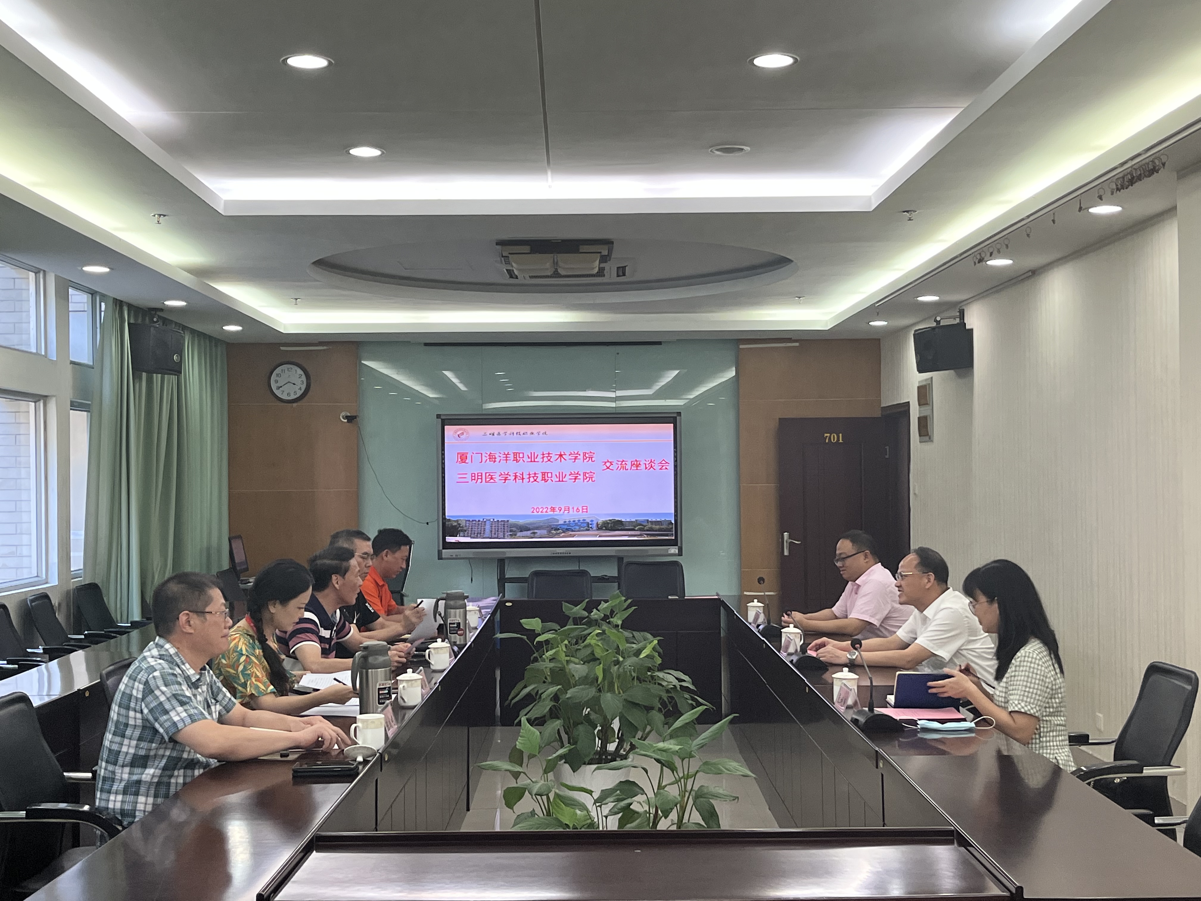 三明医学科技职业学院党委委员、副院长赖焕标等与马国玄一行进行座谈,就“三全育人”综合改革试点项目、学生宣传中心建设、劳育特色项目等进行交流。