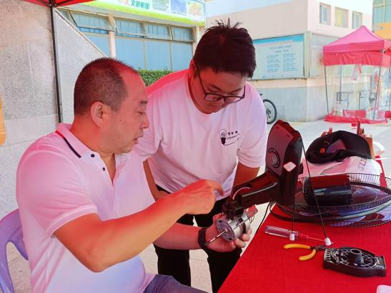 居民们纷纷带来家中有故障的电风扇、电饭煲、烧水壶等电器。在老师的指导下,队员们熟练地拿起万用表等仪器对家电进行“把脉诊断”,剪切、焊接、试机,一台台“沉睡”的家电在他们手中逐个“苏醒”。