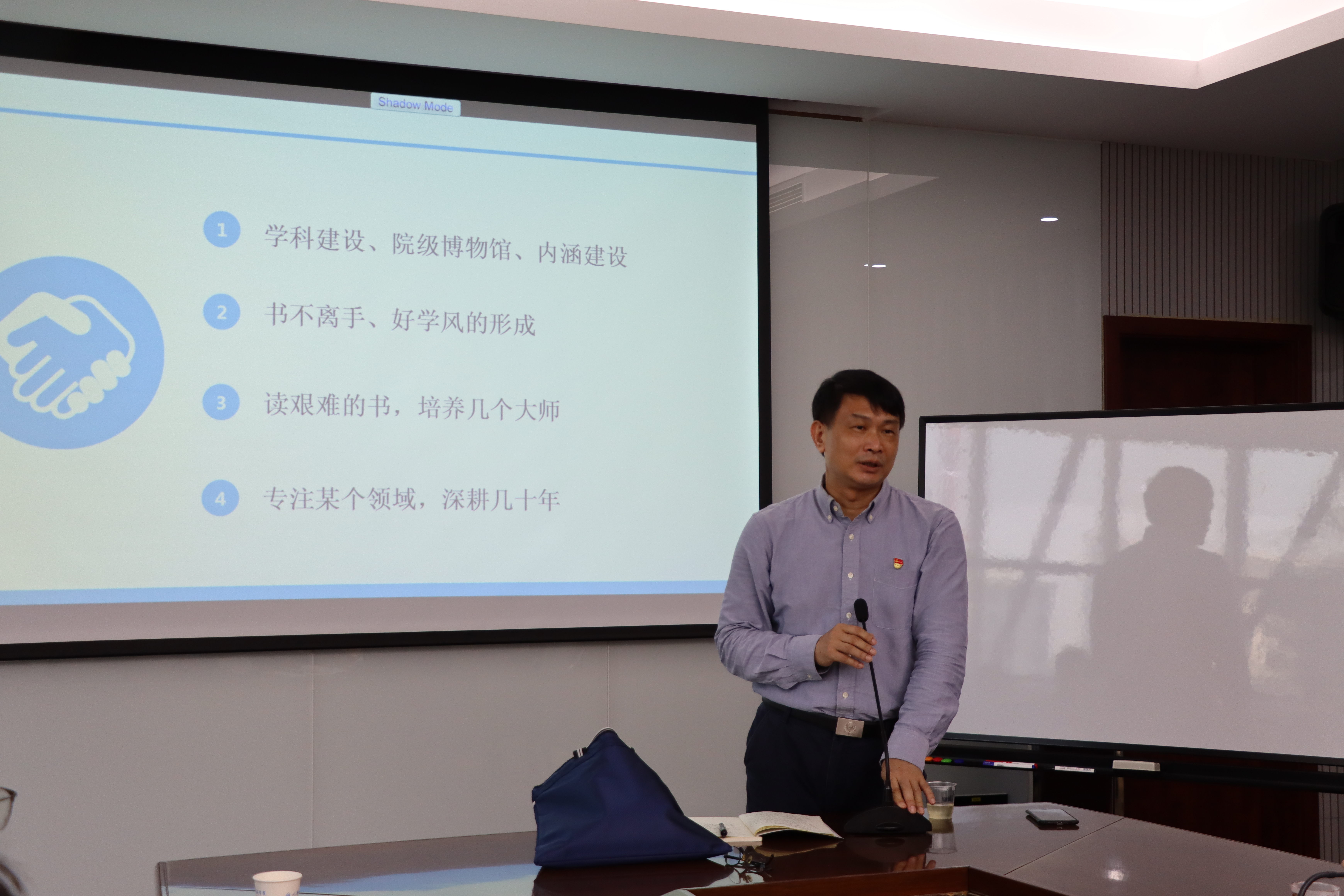 陈一端以结合实际、深入浅出的语言风格,围绕学科建设、学风建设、教师发展等方面进行阐述。他指出,党员干部们要精读马克思主义理论相关著作,深入学习马列主义文化精髓,严格要求自己,切实提高思想觉悟。教师要争做学科建设的领头羊,向学科泰斗学习,主动了解行业领域的最新研究动向,注重学科内涵建设,形成浓厚文化氛围;要养成书不离手的好习惯,专注、深耕某个领域,努力塑造自己,树立榜样,带领学生构建优良学风;研究策略应与时俱进,要积极学习借鉴研究国内外先进的创新模式和研究方法,搭建团结、协作的交流平台,扎实推动研究创新,培养特色,关注本土,创造价值。