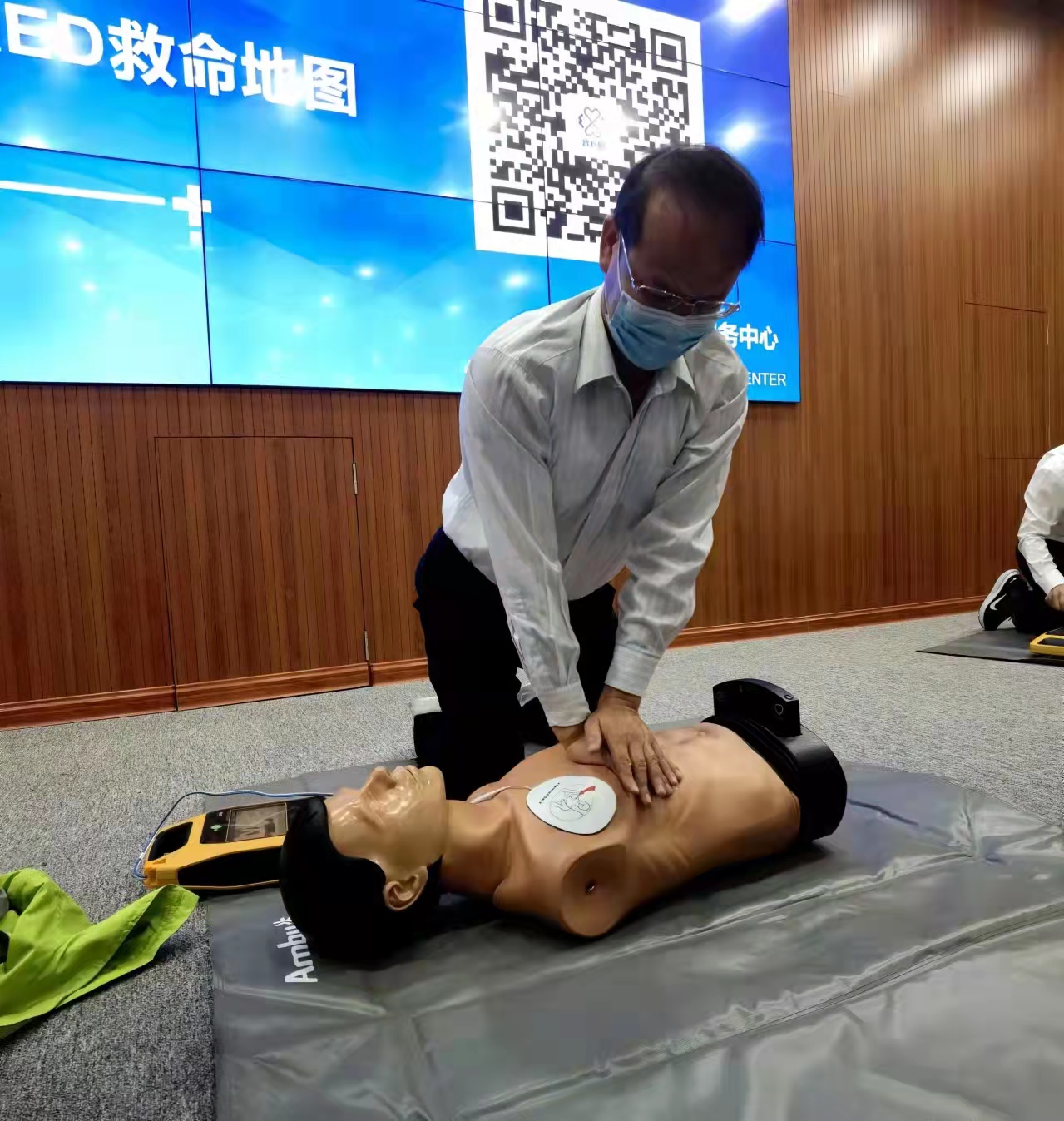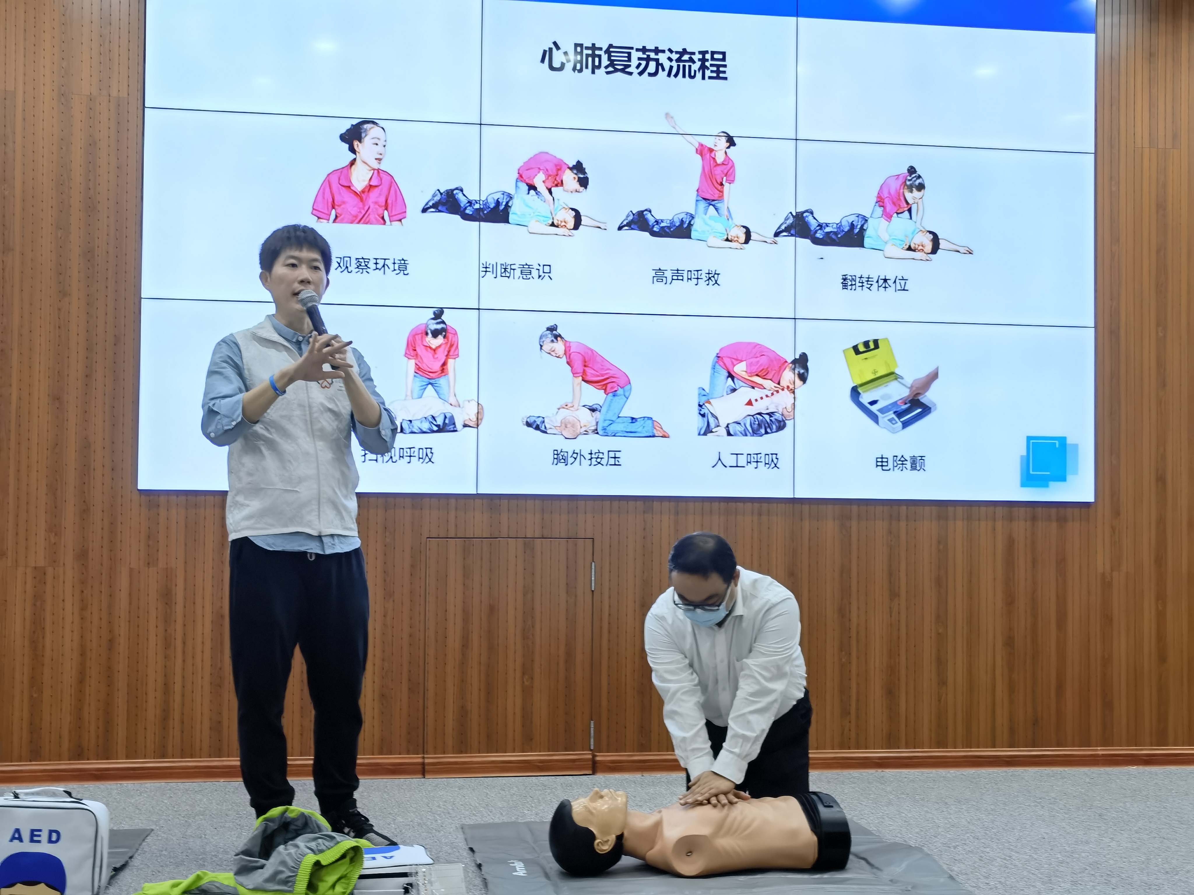 培训中,协会林晨晖医生介绍急救相关知识,列举猝死实例,强调急救“黄金四分钟”的重要性,结合胸外按压与除颤仪(AED)的使用,展示心肺复苏全流程;吴米纳医生现场演示了呼吸道异物堵塞的应急处置。培训同时组织老师和学生代表上台实操,让在场人员真正掌握除颤仪的正确使用方法、心肺复苏和呼吸道异物排除的具体动作要领。