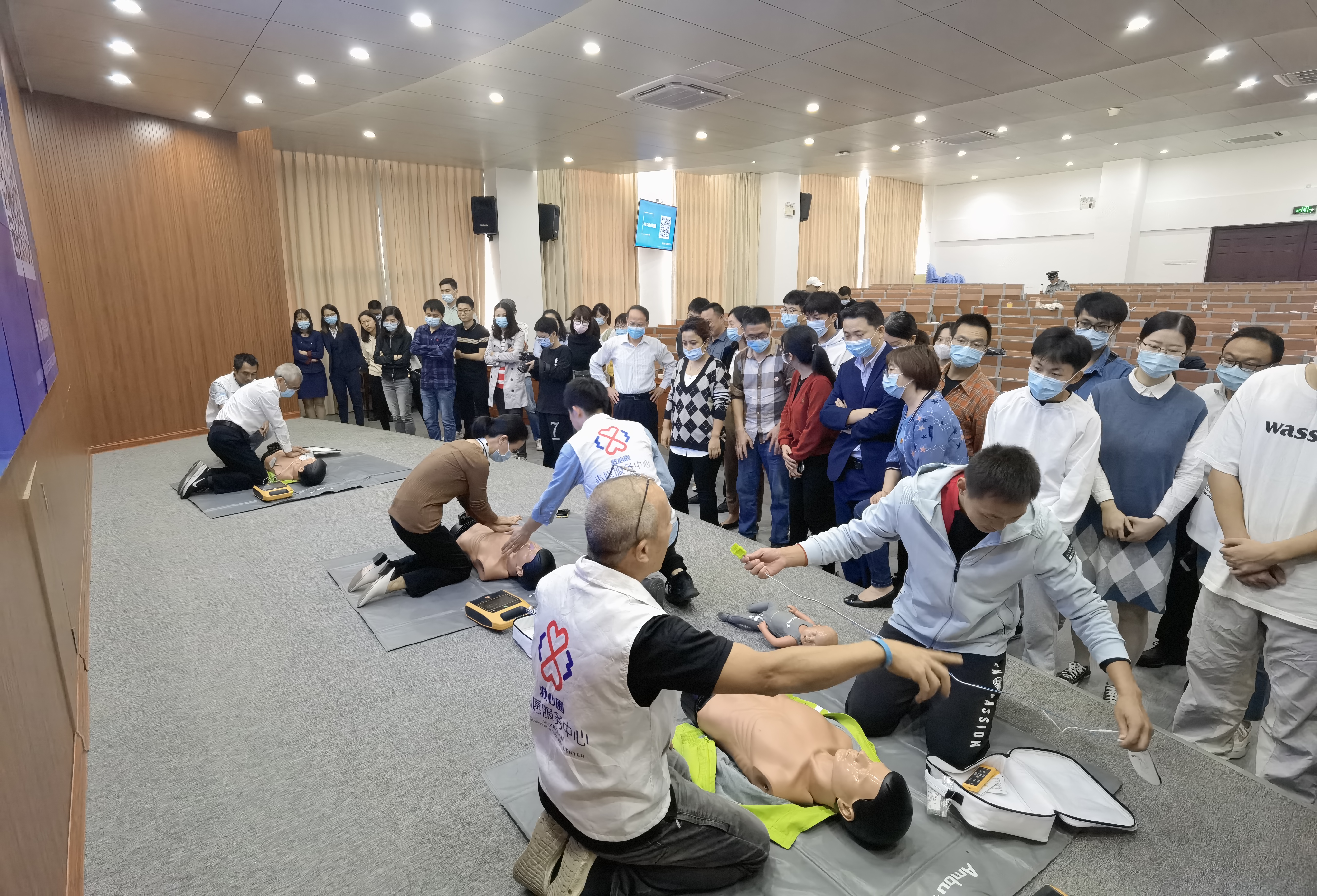 本次急救知识科普讲座是辅导员素质提升工程系列活动,通过学习和实操,提升辅导员的自身防护与自救互救能力。学校全体学工系统干部,体育老师、宿管和学生代表近百人参加。