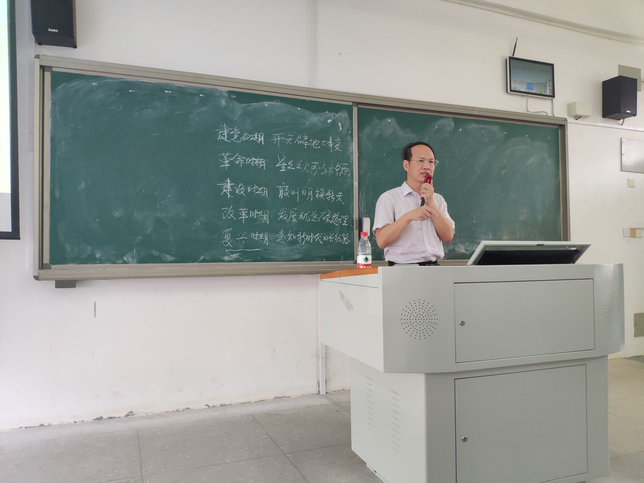 马国玄从“马克思主义为什么行”,讲到“中国共产党为什么能”,进而分析“中国特色社会主义为什么好”,层层递进,循循善诱。他从“建党初期、革命时期、建设时期、改革时期、复习时期”党的发展五个时期,用通俗易懂的语言进行阐述,加深了学生的理解。他指出,党从诞生之日起,就把实现人民解放和幸福鲜明地写在自己的旗帜上,融入到全部的奋斗实践中。中国共产党人的初心和使命,就是为中国人民谋幸福,为中华民族谋复兴。在中国共产党团结带领全国各族人民,历经革命、建设和改革,使中国这个古老的东方大国创造了人类历史上前所未有的发展奇迹。