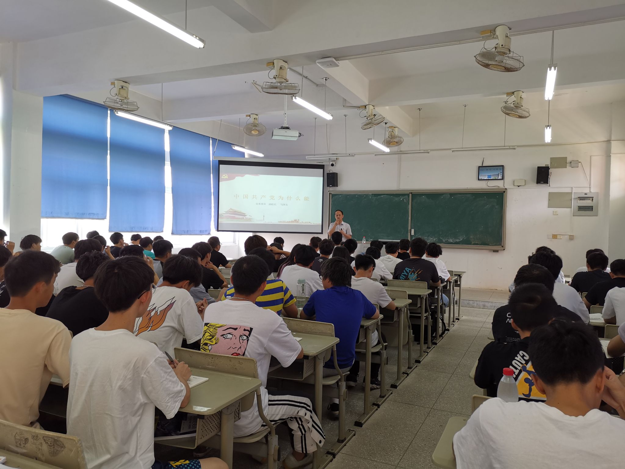 6月10日,马国玄副校长以《中国共产党为什么能》为主题为机电3203、数控3203班同学上“形势与政策”课。