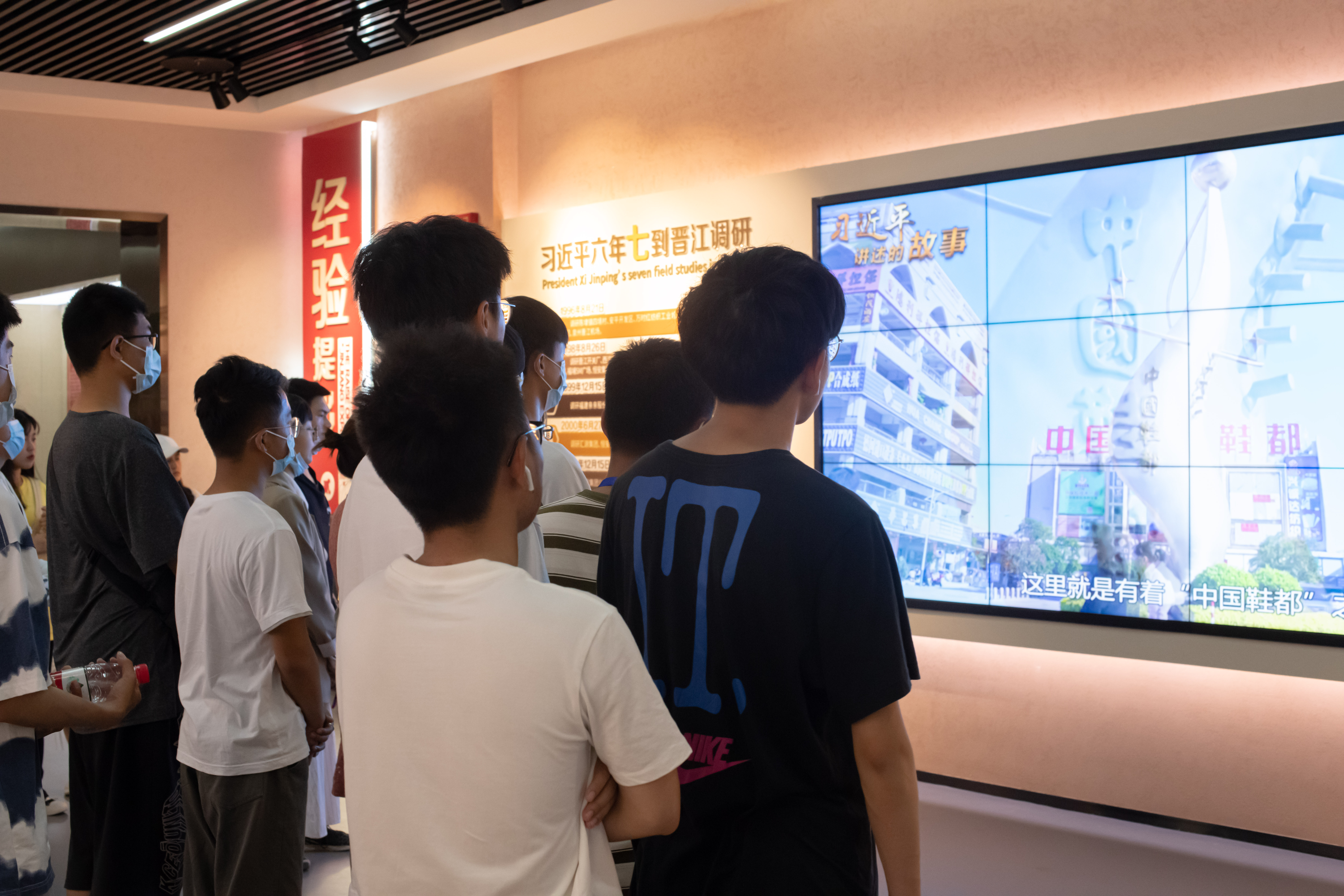 在晋江市展馆,师生跟随着讲解员的脚步,观看习近平总书记《七到晋江》、《习近平讲述的晋江故事》等相关视频,大家边听边看,重温习近平同志总结提炼的以“六个始终坚持”和“处理五个关系”为主要内容的“晋江经验”,其是对有中国特色社会主义发展道路的大胆探索和成功实践。在展馆内,多媒体营造出情景交融、重点突出的主题性空间氛围,师生们通过互动体验项目,了解晋江发展轨迹,深入学习“晋江经验”。