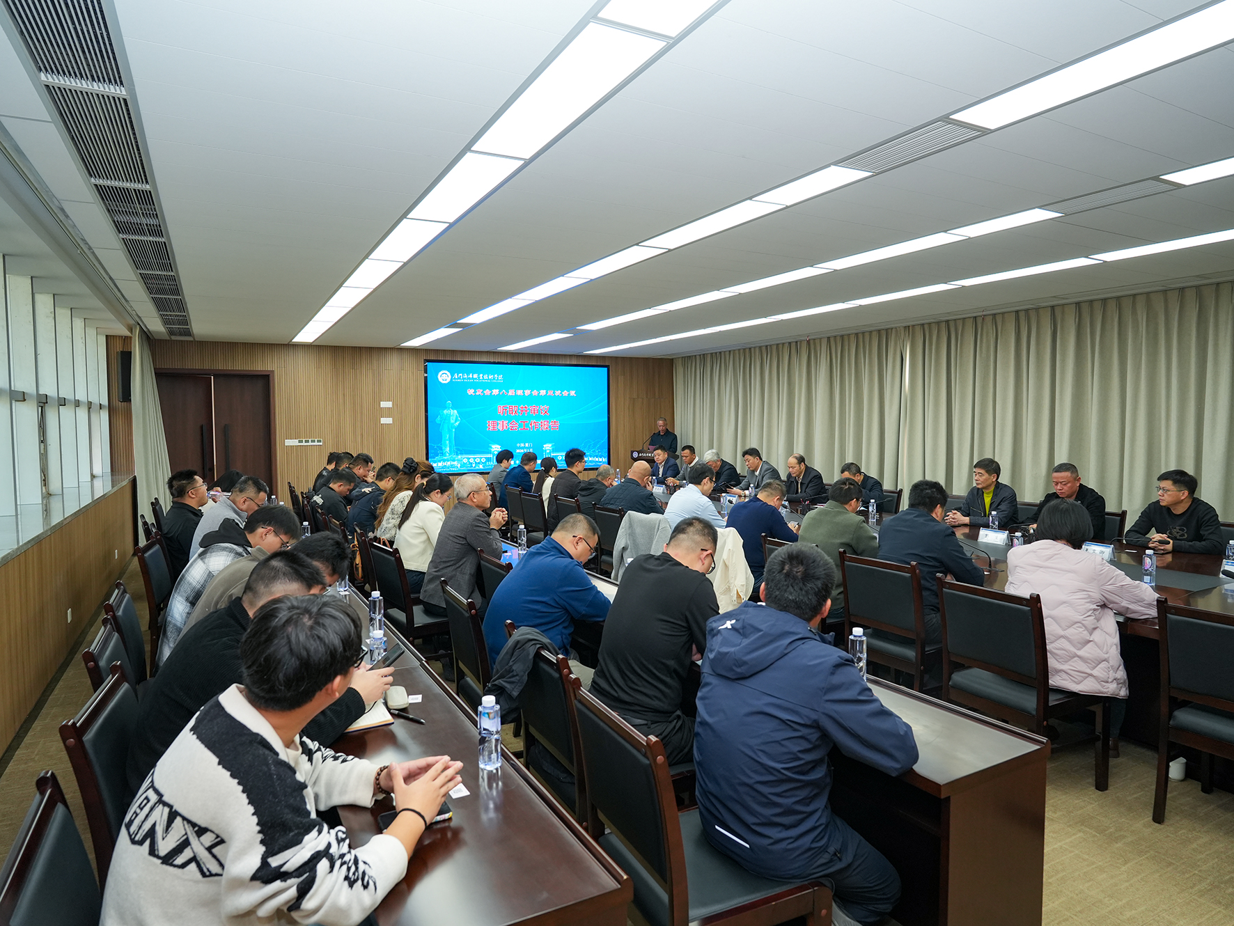 校友会第八届理事会全体理事出席会议,监事会成员列席会议,各二级学院负责人应邀参会。