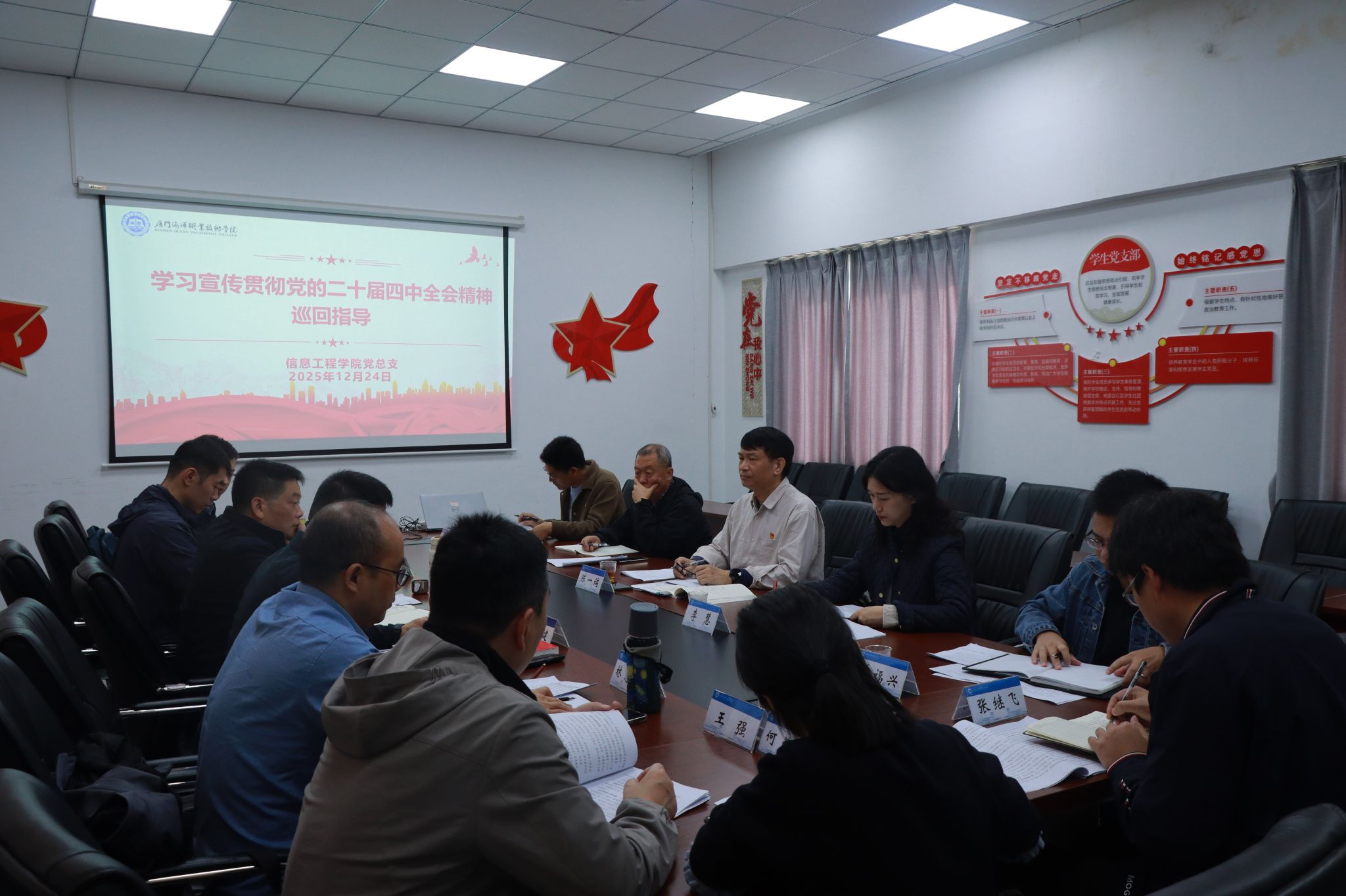 会上,信息工程学院党总支书记林晓鹏汇报了信息工程学院学习宣传贯彻党的二十届四中全会精神的举措、成效、不足,并结合学院实际,对照《中国共产党第二十届中央委员会第四次全体会议公报》《中共中央关于制定国民经济和社会发展第十五个五年规划的建议》介绍了下一阶段的落实和提升举措。
