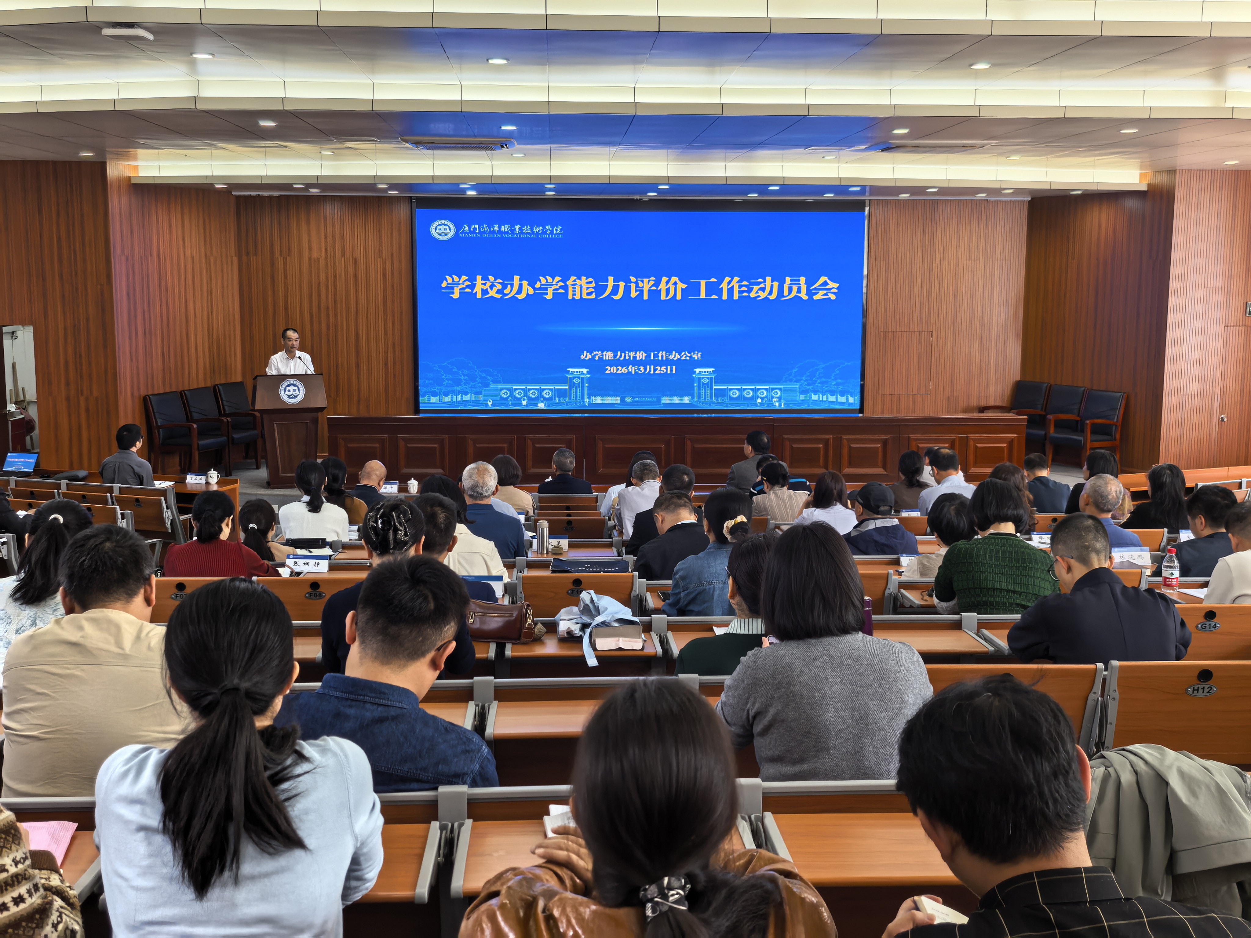 会上,院长刘光明作动员讲话,他指出办学能力评价是落实国家职业教育政策要求的重要任务,是学校实现高质量发展的内在需求,更是提升人才培养质量和社会服务能力的关键抓手。他全面回顾了学校近年来在各方面取得的标志性成果,同时客观分析了当前办学过程中存在的短板与不足,强调要以此次评价为契机,通过全面“体检”找准问题、补齐短板,为全力创建海洋职业大学扫清障碍。