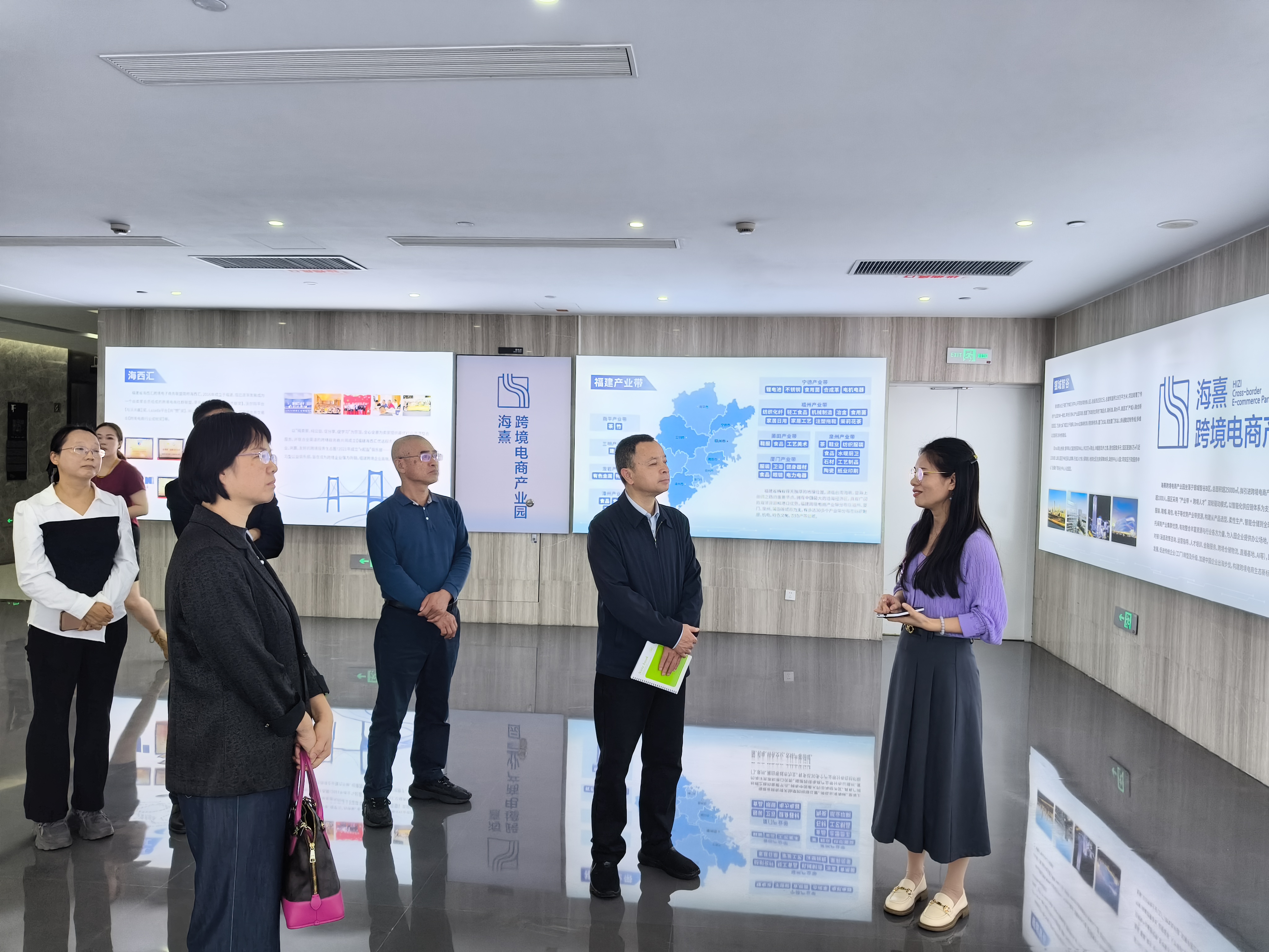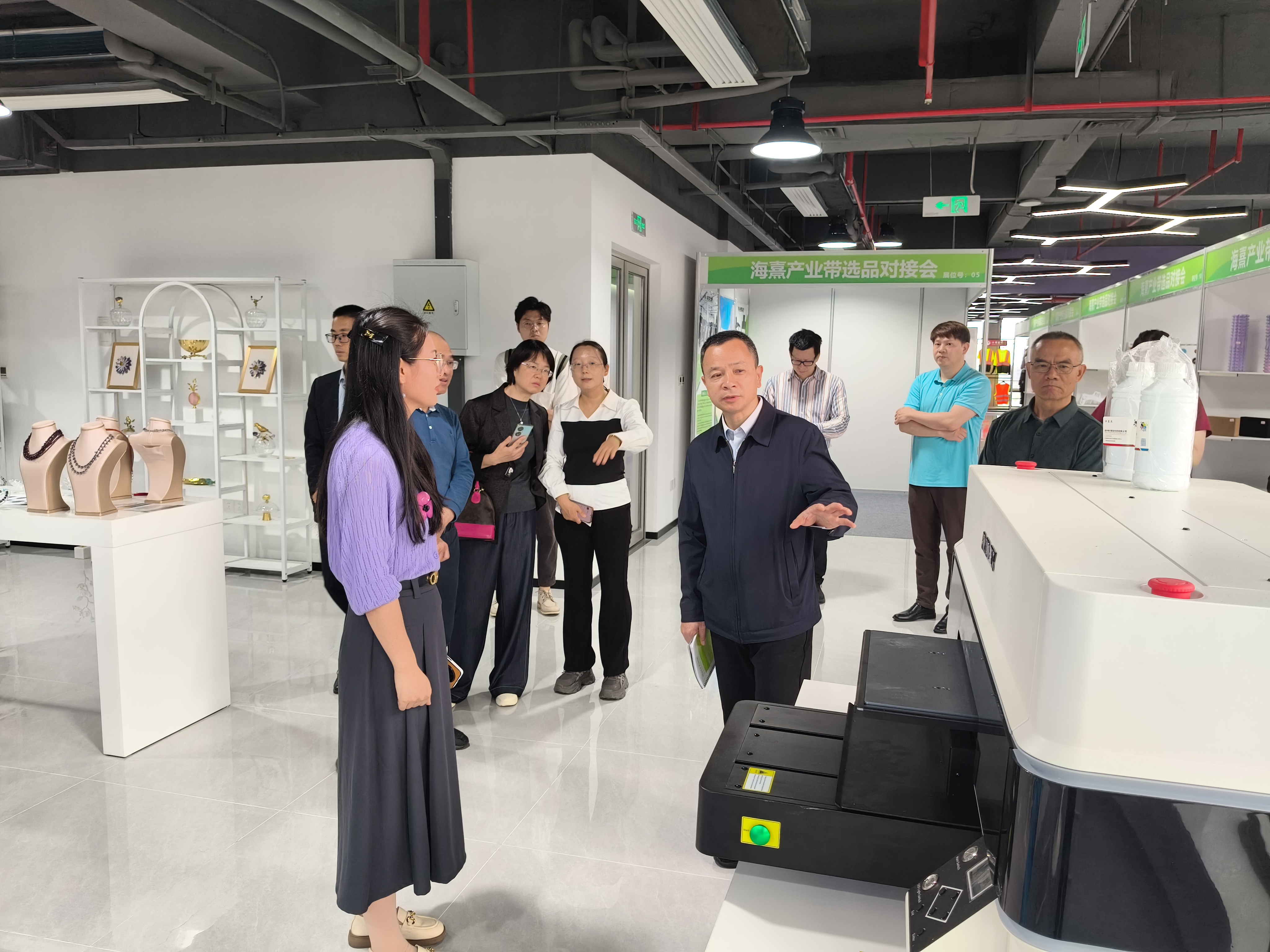 在余文婷陪同下,刘光明一行实地参观了海熹跨境电商产业园展示中心、供应链选品中心、企业孵化区、园区运营中心、众创空间、培训室及共创空间等区域,详细了解园区整体布局、运营模式和发展成效。参观过程中,余文婷介绍了产业园依托福建服装、卫浴、健身器材、眼镜等优势产业带资源,打造“产品+人才”双轮驱动运营模式的做法,以及园区在供应链整合、创业孵化、人才培养、产业服务等方面的探索实践。