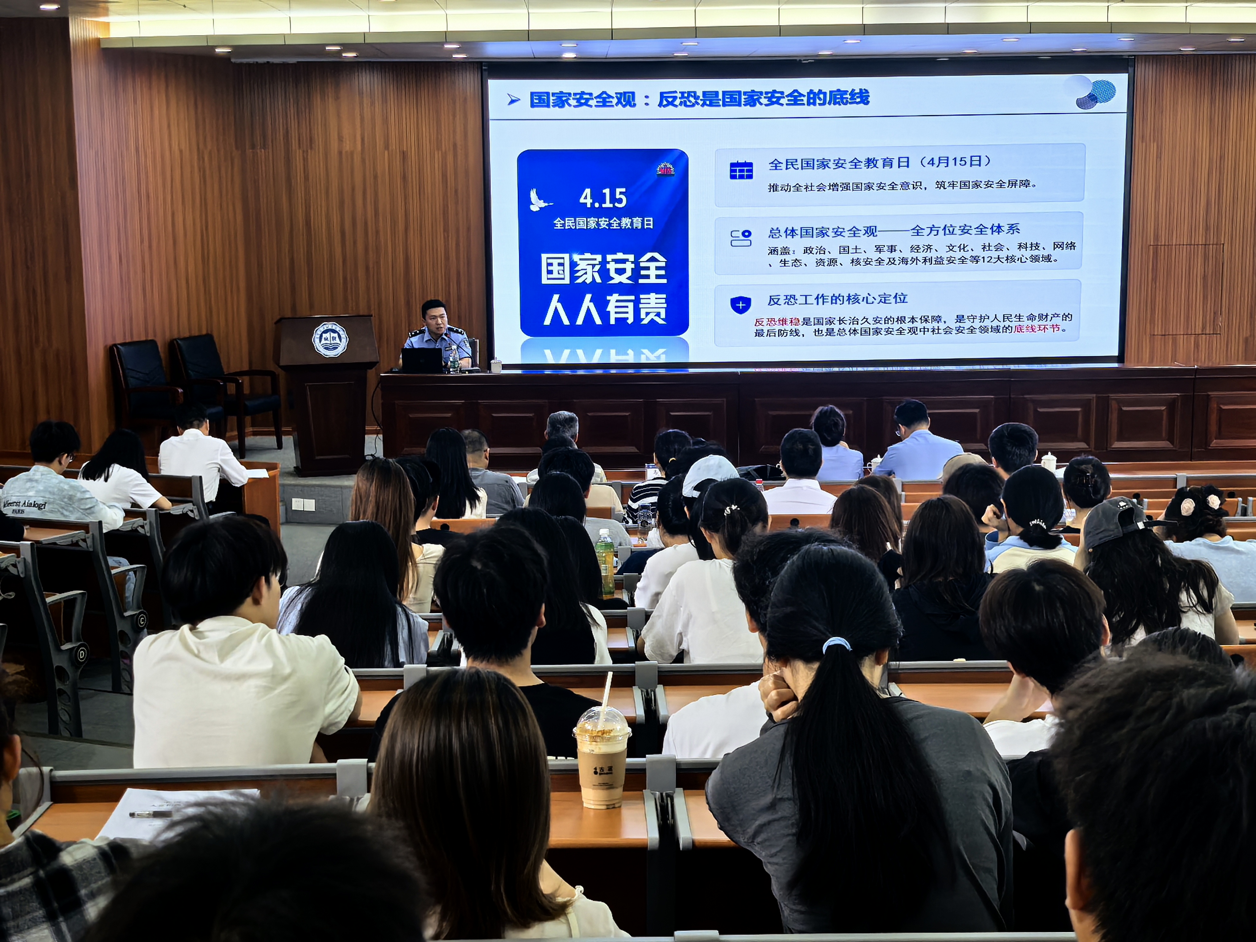 4月14日, 厦门市公安局反恐支队赖嗣超警官来翔安校区作“筑牢反恐防线,防范宗教渗透,守护校园平安净土”专题宣讲。赖警官从国家安全教育与反恐工作的内在联系出发,深入剖析当前反恐工作面临的外部形势,系统阐释了我国依法开展去极端化工作的政策实践,并结合校园实际,详细讲解了师生在日常生活学习中应警惕的风险隐患和应遵守的行为规范。市公安局叶思雨警官、翔安分局李永健、王德峰警官出席宣讲会。全校各二级单位安全责任人、安全信息员等200余人参加学习。