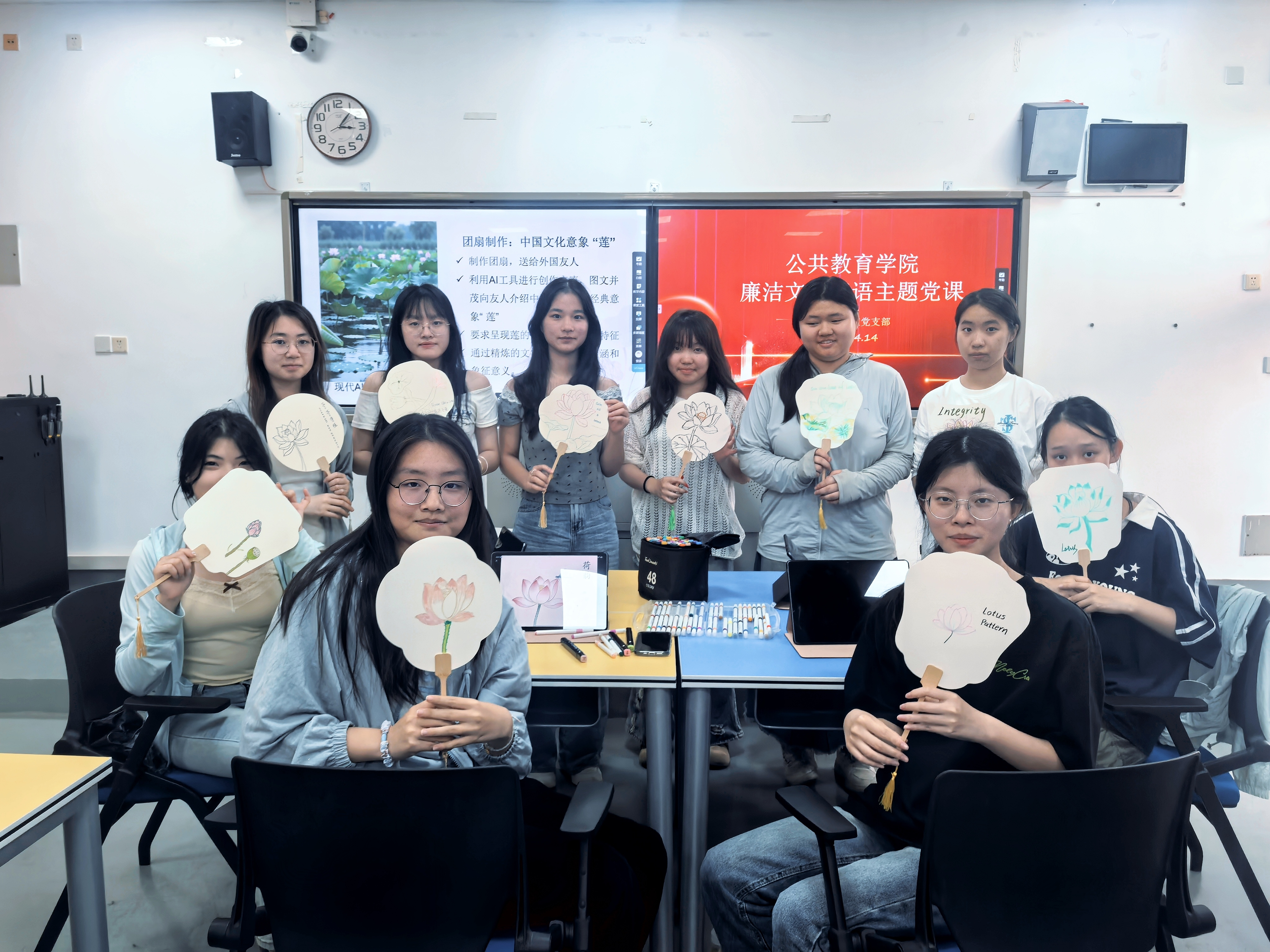 在实践环节,同学们结合所学知识,借助 AI 工具创意构思、自主完成廉洁主题扇面绘制,将莲之高洁、廉之正气融入作品,以艺术形式诠释对廉洁文化的理解。